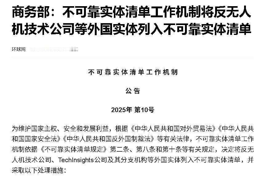 [下雨]特朗普又傻眼了?涉及美台军售,我们又出手了!10月9日,商务部当天在官网发布公告,依据相关法规,商务部决定将反无人机技术公司、TechInsights公司及其分支机构等23个外国实体列入不可靠清单。   最近美国和台湾在无人机军火交易这件事上越玩越大。美国先是一口气批了总价超过3亿美元的军用无人机还外加火控系统卖给台湾,同时还促成台湾跟美国本土的宇航环境公司和安杜里尔公司签了上千架无人机采购订单。   这些无人机体积虽小,打击能力却不弱,都是为了在台海一带刷存在感,这种“无人机拉帮结派”很显然就是美方在台海问题上想制造紧张气氛妄图牵制中国大陆。   面对美国和台湾眉来眼去,中国商务部反手就是一记重锤,把那些专门涉足反无人机技术、情报分析的美国企业,比如TechInsights、Dedrone等,一口气拉进了“不可靠实体清单”,还直接上了新闻头条。   这清单里不少企业都是这两年帮着台湾加油添醋,嚷着要让台海成为无人机决战区的关键参与方。   被列进清单之后,这些公司至少在中国的生意算是没得做了,美方盘算想借台湾搞点技术突破,现在被堵了回去。   还不止于拉黑名单这么简单,紧接着中国还宣布对稀土技术进行全链条的出口管制。你美国敢给我断我的科技供应链,那中国自然不可能任你牵着鼻子走。管制一落地,全球都得重新盘算盘算稀土从哪里买   美国也没闲着,旧案未了又添新愁,刚对15家中国公司痛下狠手,理由是它们把美国制造的无人机芯片转手卖给了哈马斯和胡塞武装。   这就是美国用一个莫须有的“安全”理由,又想多给中国制造点麻烦,希望通过制裁压制中国高新科技走出去。   近年来中美的技术较量像一场你追我赶的游戏,美国自从在贸易制裁加码后,对中国高端产业卡脖子、加高壁垒,中国则反手就按下了稀土出口的暂停键”   中国占了全球将近一半的稀土储量,每年全世界70%的稀土也是中国生产的,中国收紧了管理条例,现在又多了个出口准入门槛。   美国想找澳大利亚等地当接盘侠,结果人家的产能远远跟不上,中国这一招等于直接掐住美国半导体和新能源的命门。   回到台海和无人机,美台联合造无人机的计划虽然动作很猛,美军高层甚至公开叫嚣,要把台海变成无人机战场,结果中国这边强势回怼,谁要想做“搅局者”就先掂量掂量自己的后路还在不在。   对那些明知带头搅局还大张旗鼓跟台湾玩军技合作的美国企业,中国干脆一刀切,甭想在中国市场分一杯羹。   既然美国敢伸手制裁中国公司,中国就用自己的底牌反制,不只掐关键原料,还让对手没法赚中国人的钱。   眼下,台海局势被推向前所未有的高压状态,美国看似声势浩大,可面对中国手里的稀土资源和反制政策,真要持久下去谁更被动已经很明显。   特朗普想靠对台军售来巩固所谓的印太战略,但现实却让美国企业的算盘一个个落空,弄到最后倒是让外界看清楚,谁才是真正能决定游戏规则的人。