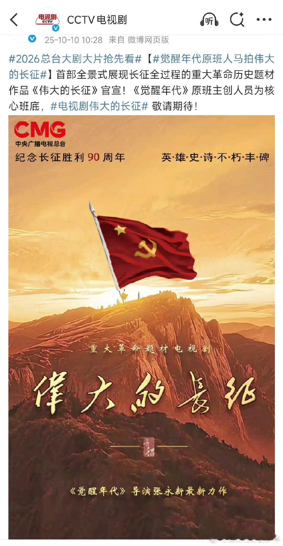 2026总台大剧片单 张晚意今天参加央视2026节目的发布会,宣传总台明年的重点大剧《伟大的长征》,是觉醒年代的原班人马,张晚意正小生🐮