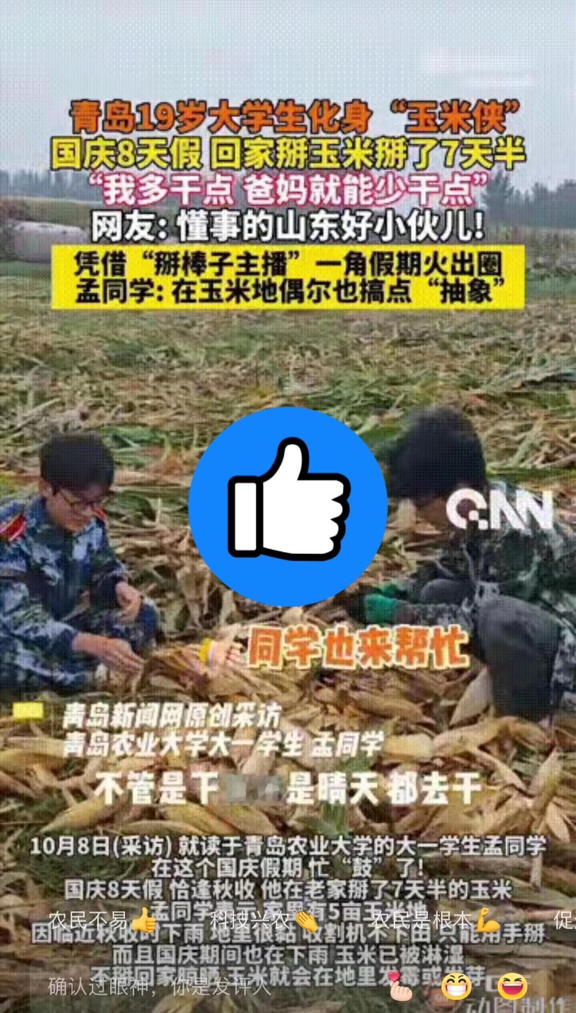 国庆假期,别人晒旅游,青岛这位大一男生却在玉米地“渡劫”! 带俩同学狂干7天半,硬是啃下5亩玉米地。每天凌晨五点半揣馒头出征,胳膊被玉米叶划得像“红格子衫”,手心磨破贴创可贴接着干。 同学半小时就蔫,他还手把手教技巧。干到深夜11点,老爸送灯红了眼,他倒催着老爸去帮老妈看水果摊。 网友看了直夸,还被戳得想起自家农活。这哪是收玉米,分明是把孝心种进了地里!你假期帮家里干活了吗?
