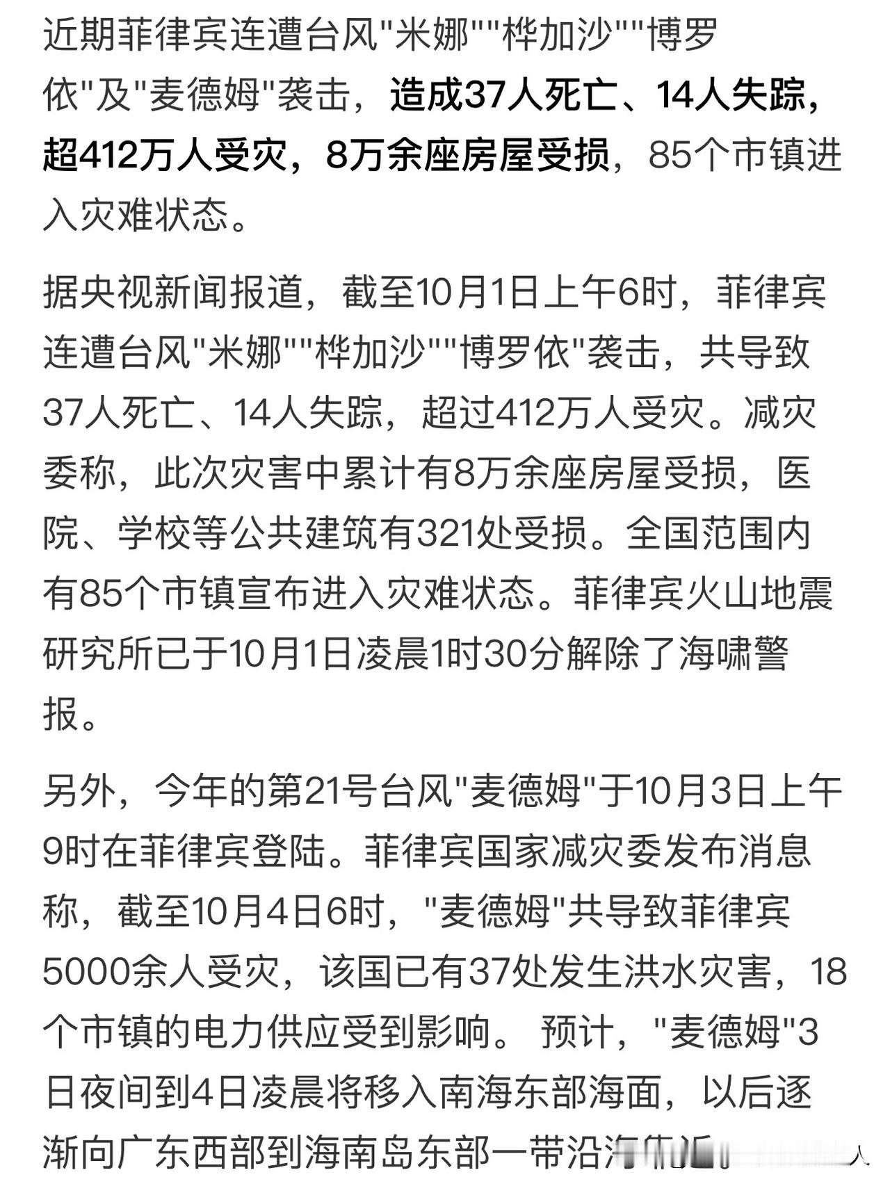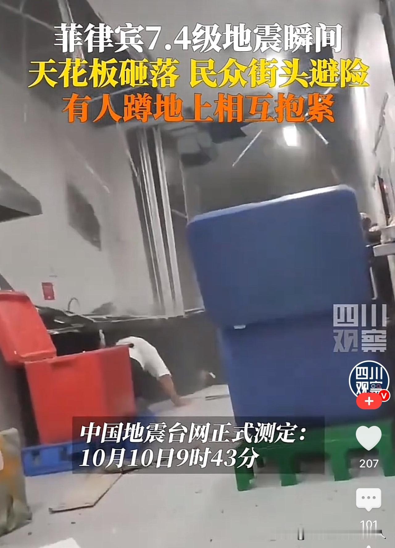 突发,10月10日,上午9点44分,小菲棉兰老岛发生7.3级地震,并触发海啸预警。 …… 小菲最近是怎么了,流年不利啊,台风接二连三(米娜,桦加沙,博罗依,麦德姆),地震也接二连三(9月30日6.9级,损失惨重) 这是,天怒人怨? (建议把仁爱礁坐滩军舰拖走,可能是破军舰影响了风水,又影响了国运。)