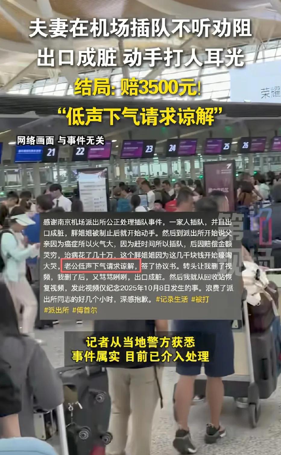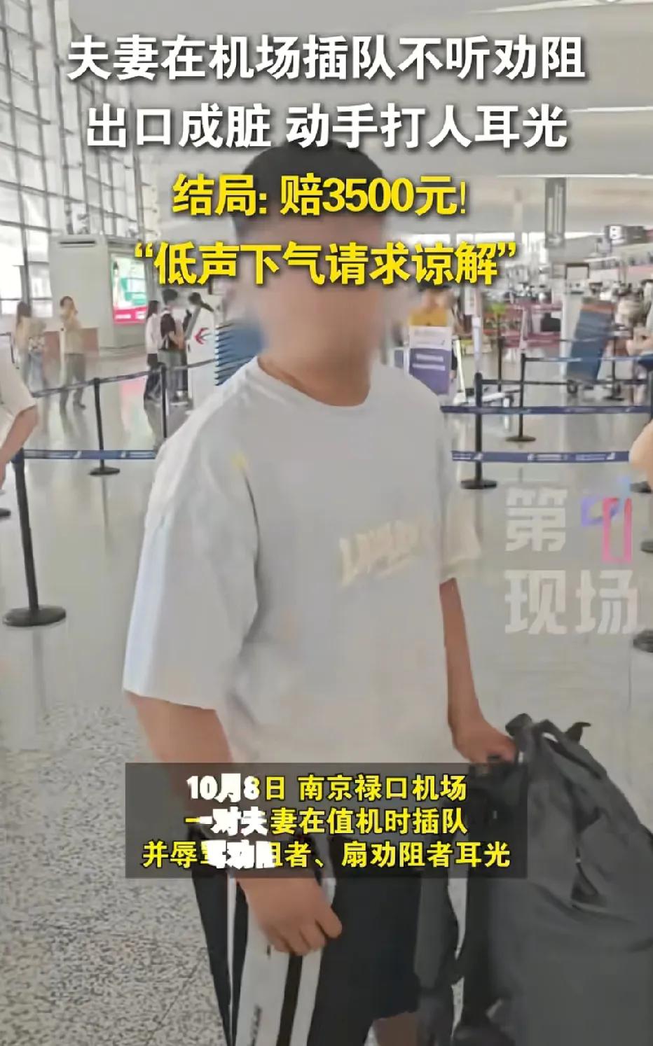 南京,男子排队值机,一家4口突然径直插队,他提醒插队不对,谁知,遭到这4人围上来辱骂推搡,一女子更是直接甩了他两记耳光,男子被重重摔在地上。他当即报警,而这家人的结局,让网友吵翻了。 南京禄口机场进站大厅内,随着民警调解结束,一家4口低着头向戴某递上3500元赔偿款,还诚恳向他道歉。 谁能想到,几小时前,他们还因插队被劝诫,对戴某又打又骂,态度嚣张至极。 更让人意外的是,签字道歉后,女子竟再度骂骂咧咧,逼得戴某忍无可忍曝光视频,让这家人的结局彻底在网上炸了锅。 故事要从早高峰的进站队伍说起。 当时,戴某拎着行李箱跟着长队缓慢挪动,眼看即将检票,他正整理口罩准备证件,一阵急促的脚步声突然从侧后方传来。 没等他反应,一家4口人径直穿过队伍缝隙,硬生生插在了他正前方。 戴某皱起了眉,他轻声提醒:您好,大家都在排队,这样插队不太合适吧? 可这话瞬间点燃了对方的火气。中年男子猛地转身,脸涨得通红:关你屁事!我们赶时间,插个队怎么了? 身旁女子也尖着嗓子附和:多管闲事!耽误登机你赔得起吗? 果然不是一家人不进一家门,4个人立马拦住戴某,对着他一阵辱骂推搡。 戴某还想辩解着赶时间也不能坏规矩,但他的声音,瞬间被这4个人的声音淹没。 他们不顾戴某劝阻,硬生生插队。 戴某气的拿手机录视频。 中年男子突然伸手推了他一把,嘴里振振有词,少装好人! 两个女子也在一旁起哄。更让人意外的是,一个胖女子突然上前,抬手就朝戴某脸上扇去。 “啪!啪!”两记耳光清脆响亮,周围乘客都惊得停下动作。 戴某被打得脑袋发懵,踉跄着摔在身后的行李箱上,后背传来一阵刺痛。 捂着发烫的脸颊,看着依旧嚣张的4人,戴某当即掏出手机报警。 民警赶到后,调取监控、询问在场乘客,很快还原了全过程。 面对铁证,4人终于没了底气,尤其是动手的胖女子,眼神躲闪不敢抬头。 当听到需要赔偿3500元时,她更是当场嚎啕大哭,她的丈夫则急忙上前,对着戴某低声下气求谅解。 看着对方态度软化,戴某心一软,签了调解协议书,还删了录制的视频。 可没成想,刚结束调解,那名胖女子又开始骂骂咧咧。 戴某忍无可忍,重新把视频发到网上。 不少网友怒批:这哪是认错?分明是听到赔钱才服软!就该拘留加罚款,对这种无赖必须严惩! 也有网友认为:3500元赔偿+公开道歉,已经是按规处理,都调解了,女子再还揪着不放真是没有得到教训。 还有网友关注到细节:带着孩子还这么嚣张,不仅没守规矩,更给孩子做了最坏的榜样,比赔钱更该反思的是家教! 那么,从法律角度,该如何看待这件事呢? 胖女子扇耳光并导致戴某摔倒受伤的行为,违法性更为明确。 《治安管理处罚法》第43条规定:殴打他人的,可处五日以上十日以下拘留,并处二百元以上五百元以下罚款;情节较轻的,处五日以下拘留或者五百元以下罚款。 若戴某的伤情经鉴定达到轻伤二级,如出现鼓膜穿孔等,则女子可构成《刑法》中的故意伤害罪,需承担三年以下有期徒刑、拘役或管制的刑事责任。 有人说,3500元赔偿款太少了,合理吗? 《民法典》第1179条规定:侵害他人造成人身损害的,应当赔偿医疗费、护理费、交通费、营养费等为治疗和康复支出的合理费用,以及因误工减少的收入。 最终4人赔偿的3500元,并非随意定价,而是符合法律规定的人身损害赔偿范围。 胖女子在签字道歉、支付赔偿后又骂骂咧咧的行为,虽未直接违反调解协议中赔偿+道歉的核心义务,不构成违约。 但仍需承担相应后果:若辱骂内容具有侮辱性且情节严重,戴某可单独就该辱骂行为报警,要求公安机关依据《治安管理处罚法》对其进行处罚。 女子该行为进一步印证其缺乏真诚悔意,若后续双方就赔偿履行等问题再起争议,法院在判定责任时,可会将其态度作为考量因素。 对此,你怎么看?