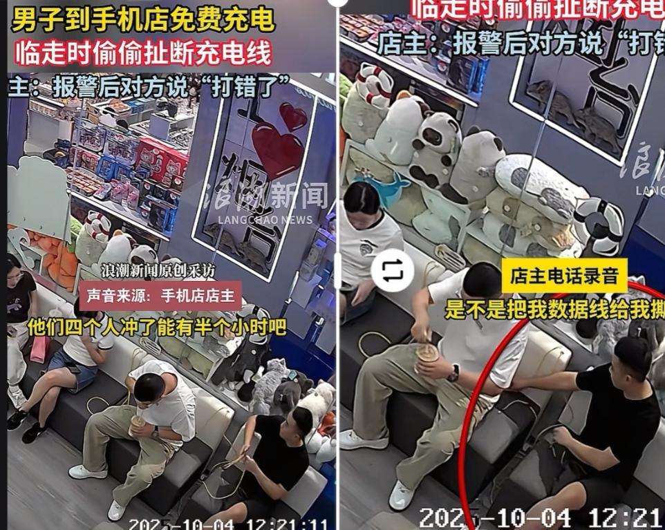 刚去查了山东烟台手机店免费充电被扯线的事儿。 万万没想到,本以为只是普通的充电纠纷,居然是明摆着的恶意破坏! 两男两女去人家手机店免费充电,充完电不说谢谢就算了,临走还趁没人注意把两根数据线都扯断了,这哪是正常顾客,分明是存心使坏! 东西虽然不值钱,但是对恶意损坏者仍然应该要求其赔偿!看到网上很多类似事情的受害方都是说“钱无所谓,只要对方一个道歉”,大概率是他们觉得谈钱就失去道德制高点了,其实受损失了要求赔偿是天经地义,大可不必羞于谈钱。 这是骨子里透着坏的人!正因为事情很小,法律惩治不了他,他才这么嚣张!但此事态度很恶劣,应该给他必要的惩罚让他长点心眼。 金额虽小,行径恶劣,必须要恢复公开执行鞭刑,才是唯一有效震慑校园霸凌,街头碰瓷等事件发生!