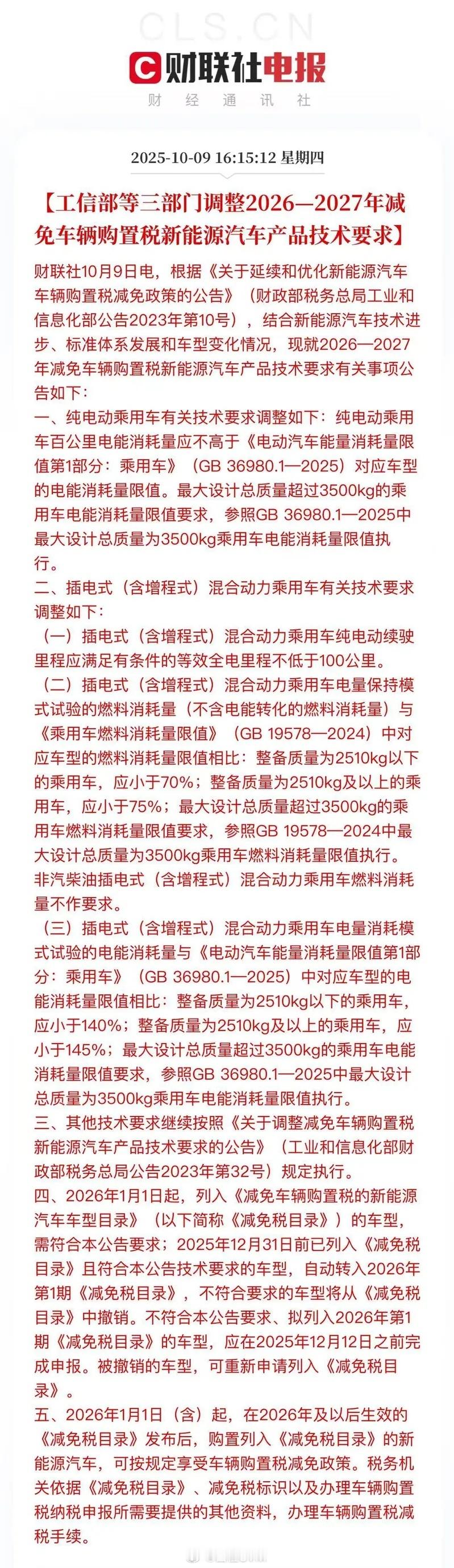 工信部、财政部、税务总局联合发布公告,明确2026—2027年享受购置税减免的新能源汽车技术标准。核心变化如下↓↓↓