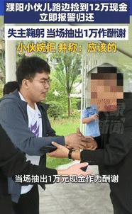 “都是实在人!”8日报道,河南濮阳,一男子在路边捡到一个手提袋,打开一看,里面竟然装得是成捆的现金,清数后发现有12万元,男子没有丝毫犹豫,急忙报警,找到失主后,对方竟豪爽的抽出1万元作为报酬感谢男子,而男子的做法,让网友直呼:格局打开了! 男子是附近小区的物业维修师傅,当天下午下班路过街角,看到路边长椅下有个黑色手提袋,看着鼓鼓囊囊的。他左右看了看,没见到有人来找,就弯腰把袋子捡了起来,入手沉甸甸的。 回到家打开袋子一看,男子愣了 —— 里面全是成捆的现金,用橡皮筋扎着,一捆 1 万,足足 12 捆。他没再多翻,赶紧把袋子拉好拉链,坐在沙发上想该怎么办。男子平时在物业工作,经常帮业主保管遗失的钥匙、手机,每次都第一时间上交,可这么多现金还是头一次遇到。 他没多想,拿起手机就打了 110。民警很快赶到他家,现场清点现金,确认总数是 12 万元。通过查看监控和走访周边商户,民警找到了失主。失主是做建材生意的,当天带着现金去给工人发工资,路过长椅时接了个电话,随手把袋子放在旁边,挂了电话就忘了拿,直到回到店里准备发工资才发现袋子不见了,急得满头大汗。 见到失主后,男子当场把手提袋还给对方。失主清点完现金,感动得不行,从里面抽出 1 万元要塞给男子当报酬。让人没想到的是,男子连连摆手拒绝,说 “这钱不是我的,我肯定不能要,换成谁捡到,只要良心在,都会这么做”。 从民警后来的讲述里能知道,男子家庭条件不算富裕,妻子在家照顾老人,孩子还在上学,全家就靠他一个人的工资生活。但他从来没动过贪小便宜的念头,之前在小区里捡到业主遗落的 5000 元现金,也是当天就上交物业,还给了失主。 失主过意不去,后来特意买了水果和锦旗送到男子工作的物业公司,还跟物业经理夸男子人品好。物业公司也把男子的事迹贴在小区公告栏里,不少业主看到后都点赞,说 “有这样的师傅在,住得放心”。 类似的拾金不昧事件在濮阳还有不少。当地派出所民警说,每年都会接到不少市民捡到财物报警的案子,有捡钱包的、有捡银行卡的,像这样捡到大额现金还主动归还的,充分体现了市民的素质。相关部门也会对拾金不昧的市民进行表彰,鼓励更多人传承这种美德。 这件事被发到网上后,网友们讨论得很热烈。有人说 “12 万不是小数,能不动心还主动报警,太实在了”,也有人说 “拒绝报酬那一下,格局真的大”。还有网友分享自己捡到东西归还的经历,评论区里满是正能量。 男子后来在物业上班时,还有业主特意来跟他打招呼,夸他做得好。他只是笑着说 “这都是应该的,谁还没个丢东西着急的时候”。 对此,你们怎么看?欢迎留言评论~