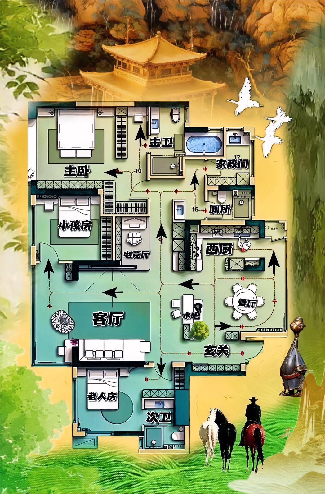 三洄游一下手,大厨太有姿势了,我严重怀疑这个魔幻大平层,修行这 么高门槛,就是为这个四合一体的饭堂! 烟火气十足餐厨区,连我被感动了!设计一点没兑水,动线也缩水,布局却是麻辣鲜香! 首先见面是水吧,三米平台,俱备三功能,一靠颜值定玄关,二凭位置出早装,三借收收做酒柜! 把宅中树,旺福旺宅生活,发挥淋漓尽致! 就差,幸福的风、阳光、黑塞和咖啡,这点小意韵! 最温柔的室内市井浪漫,尽在水吧! 当然,利用承重墙,打高柜藏冰箱,也是一绝! 写的这里,才懂生活的香气,不在房子大小,而是如何利用每一个犄角旮旯! 就如主卫的两个邻居,家政间和厕所,虽然布局打成一片,布局却,没乱套,呈现出来是温柔、愉快的感觉! 家政间,双窗阳光很治愈,厕所的窗子很透亮! 客厅日子,平淡又美好,唯一走眼就是电视墙,有门有噪音,秘密就是主角的负担,右手赠于一个隐形门,左边赠于一个电竟室! 功能多变,颜值算过关! 只能靠纳七米阳台,感受夏天的阳光、雨、白日梦…… 都,栖居于我自己的灵魂里!