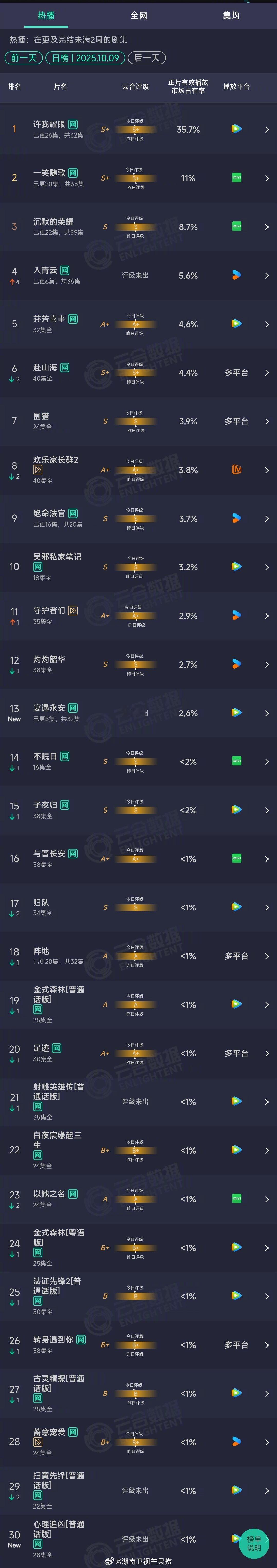 2025年10月09日云合长剧集正片有效播放量市场占有率TOP30