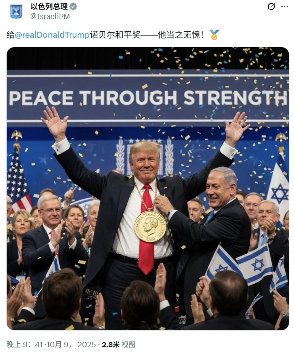 图都做好了,就看诺贝尔奖委员会了。 这是以色列总理内塔尼亚胡在社媒上发的,估计图也是他的团队做的,除了由他亲自给特朗普带上奖牌之外,台下摇动的都是以色列国旗。 先不说特朗普该不该得奖,即便特朗普获得了这个奖,颁奖人也绝对不是内塔尼亚胡,挪威甚至都不会让他去。 所以,与其说是诺贝尔和平奖,不如说是以色列颁给特朗普的“特别和平奖”。 说到这,以色列还真有可能这么干。