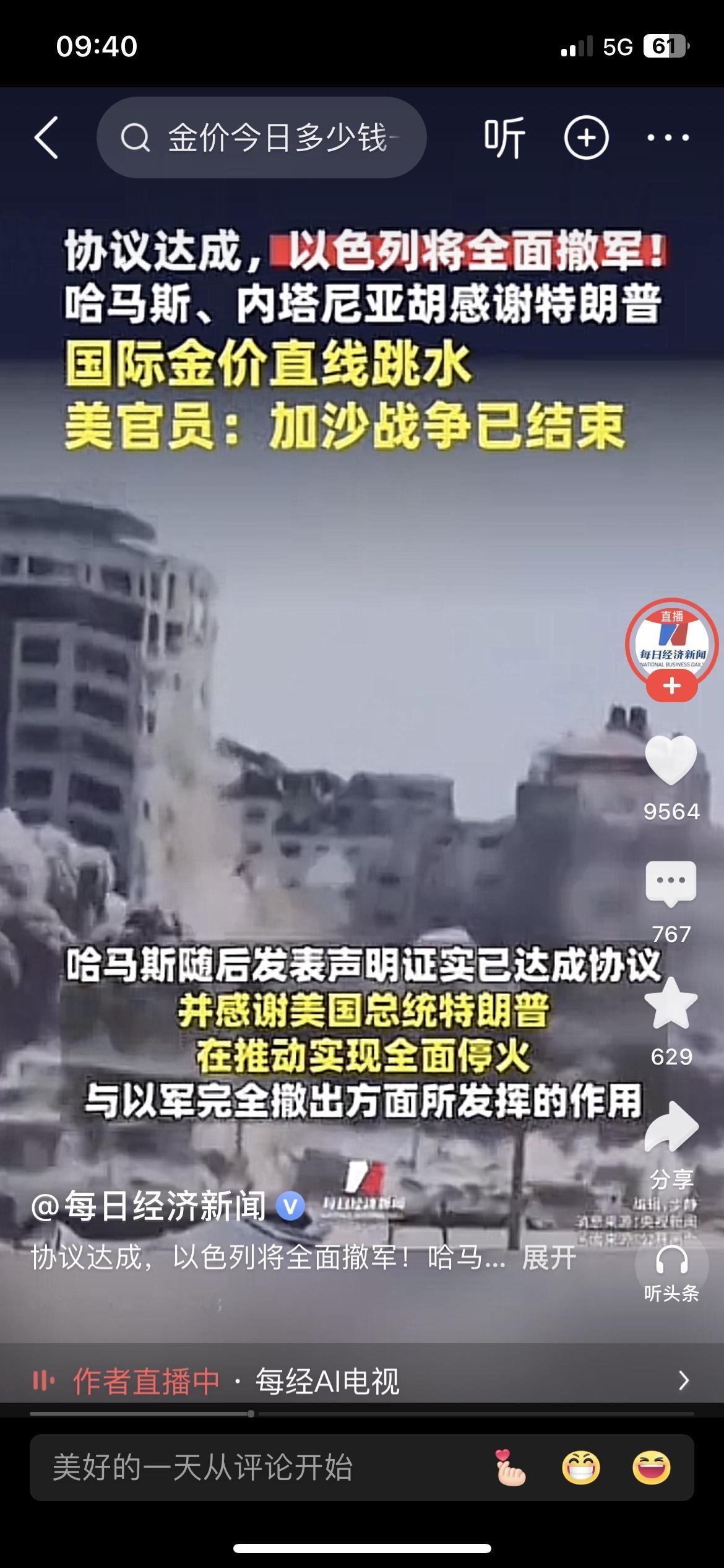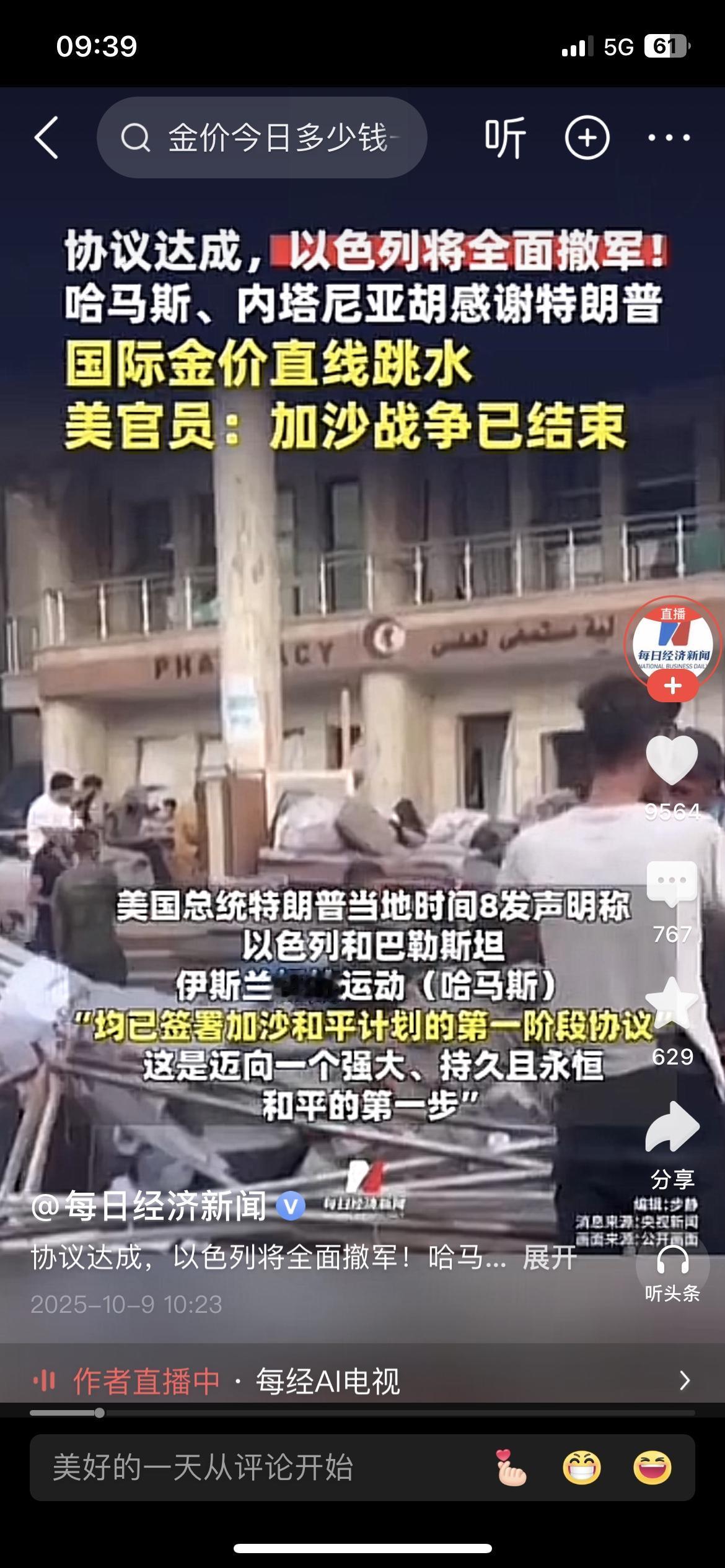 以色列全面撤军!加沙战争结束金价跳水,特朗普成关键推动者? 家人们快看大新闻!以色列和哈马斯达成协议,以色列要全面撤军了!哈马斯、内塔尼亚胡都感谢特朗普在推动停火和撤军里的作用,美官员还说加沙战争已经结束了。国际金价也跟着直线跳水。这波操作你怎么看?觉得这和平能稳住不?快到评论区聊聊!
