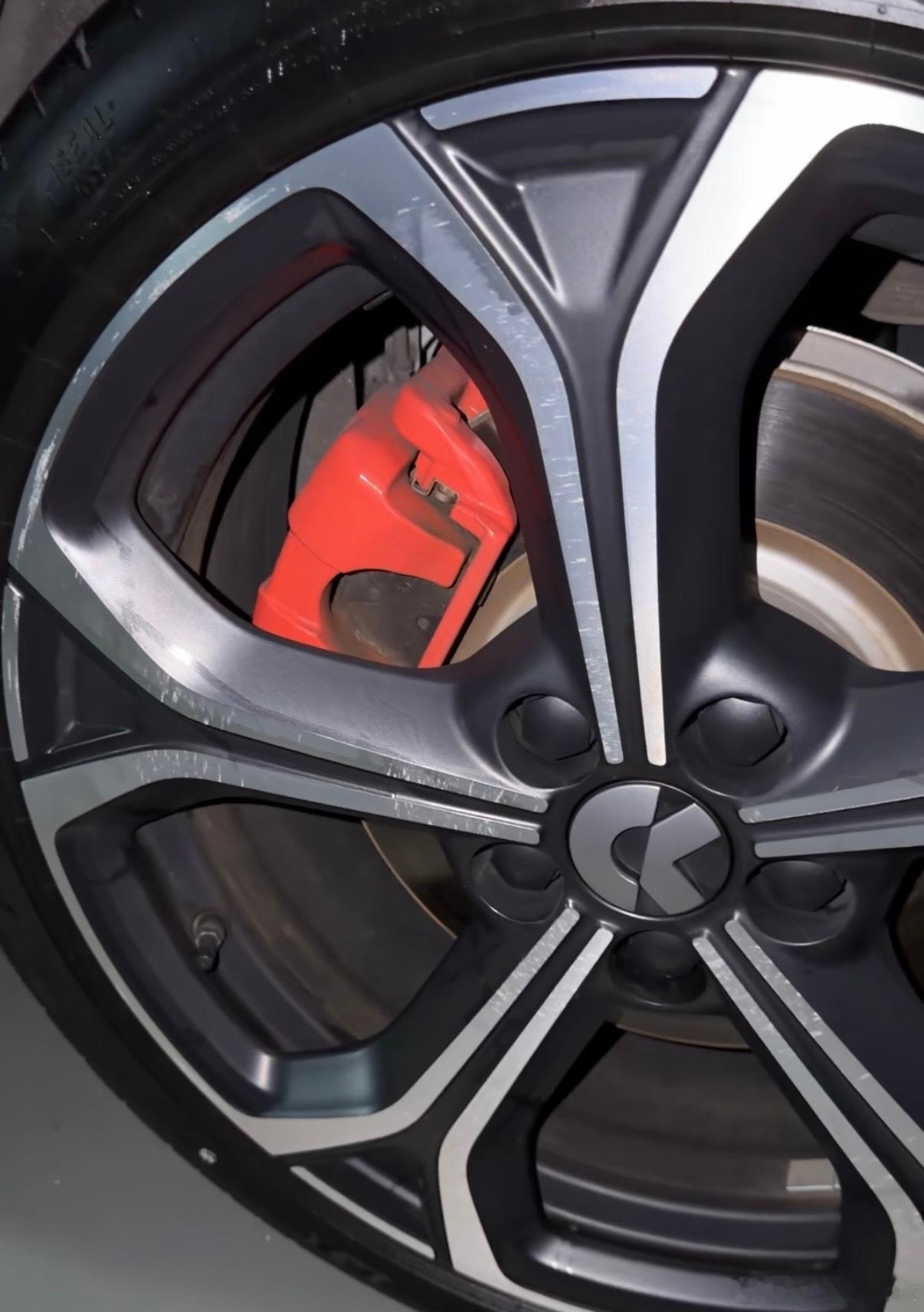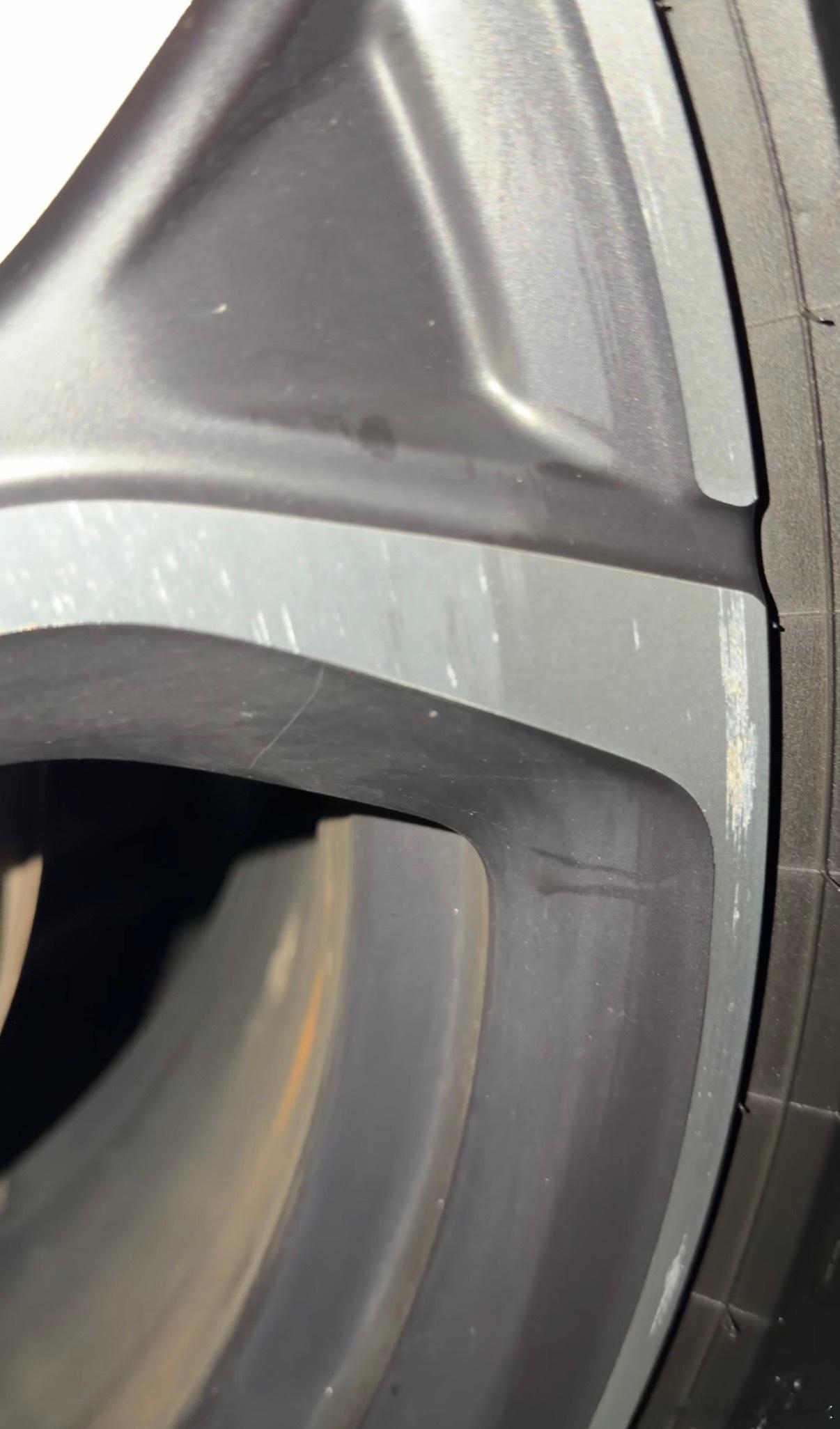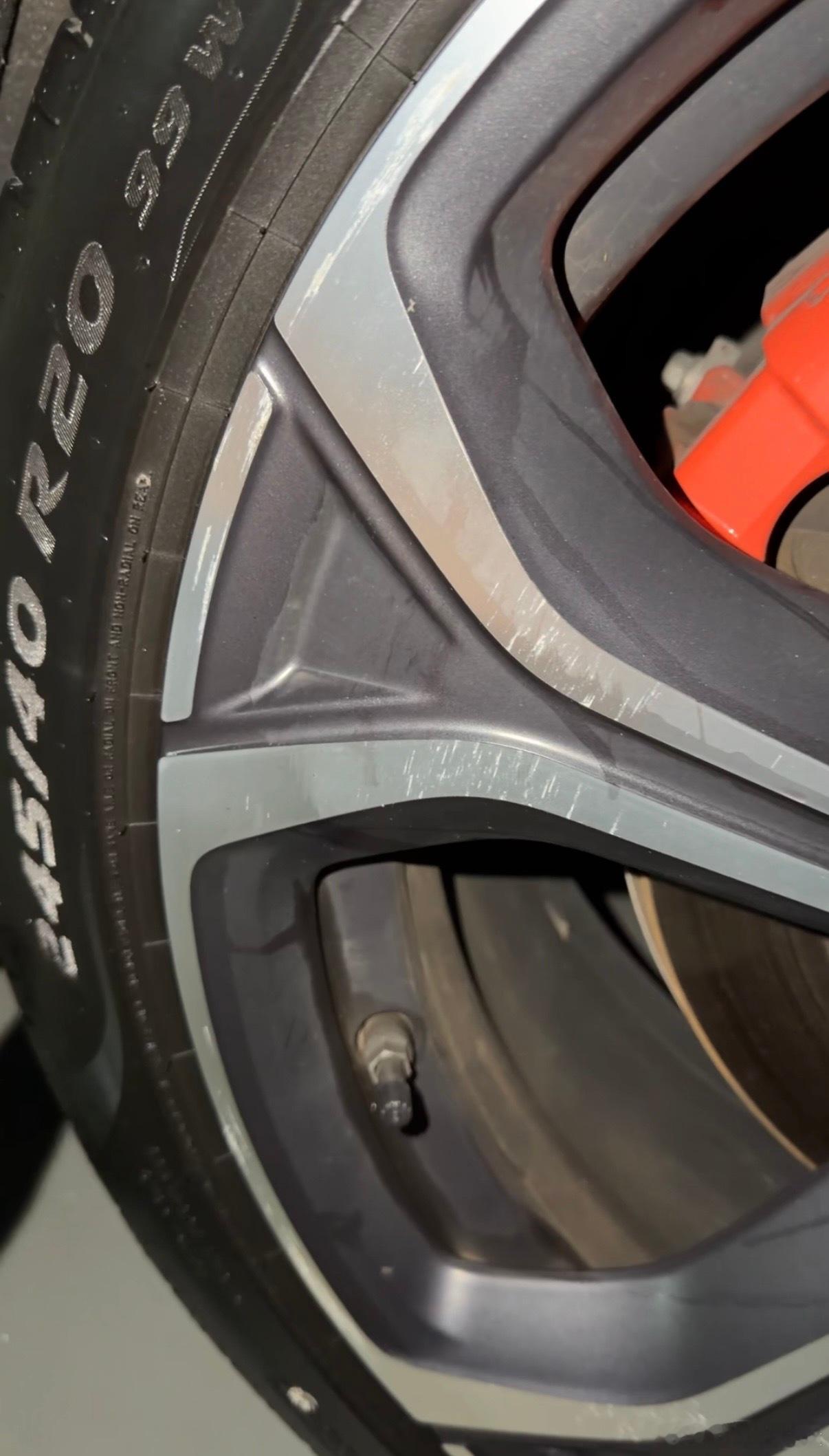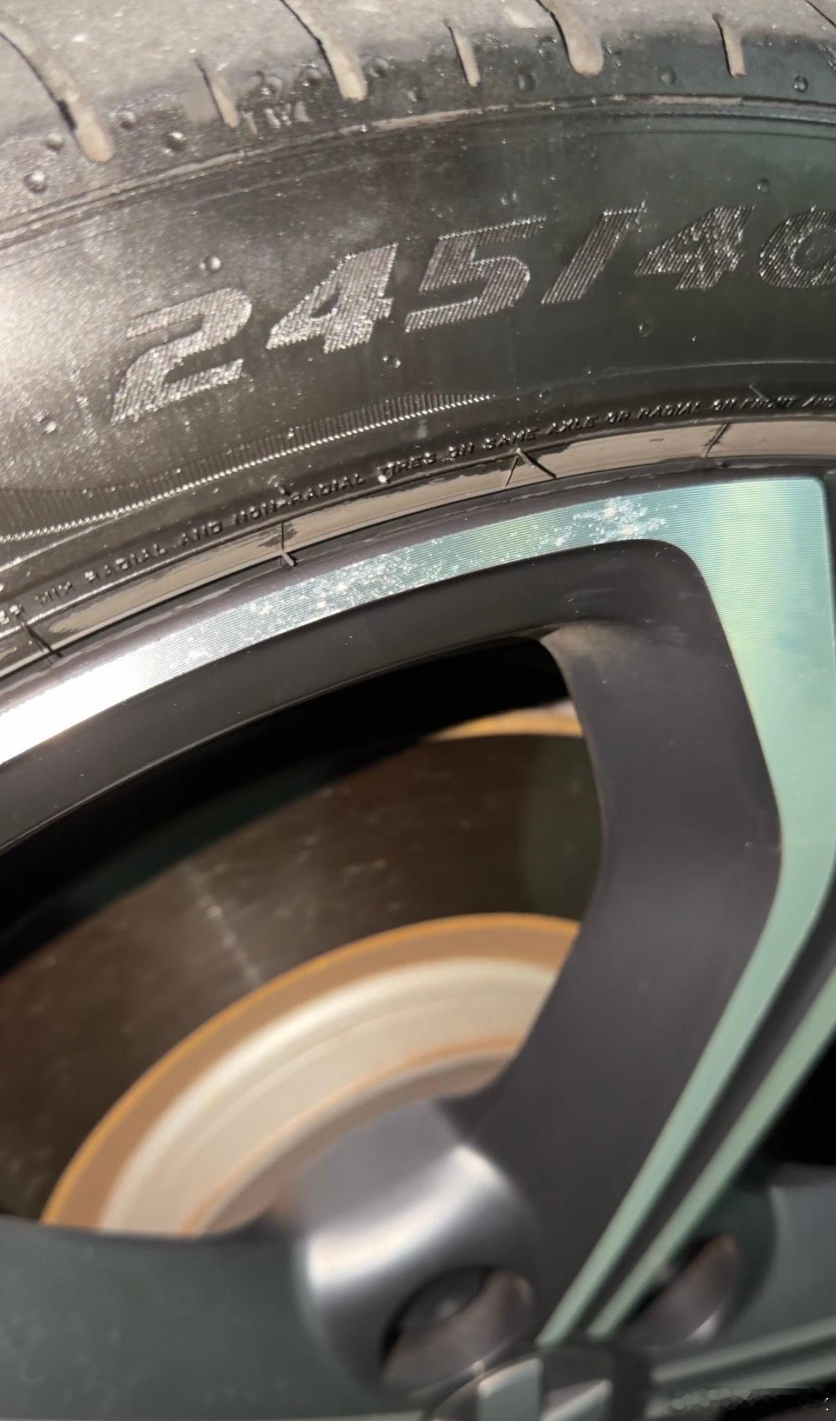 所以也算是涨知识了,原厂轮毂表面其实有一层清漆保护,如果因为磕碰了做修复,像我的拉丝轮毂就会被磨掉最外面一层,来还原拉丝效果,但是拉丝的地方直接就是金属裸露着了,所以包括观感上都是和原来有点区别的。裸露的金属部分碰到轮胎蜡就会被腐蚀,这玩意真的是没啥吊用。