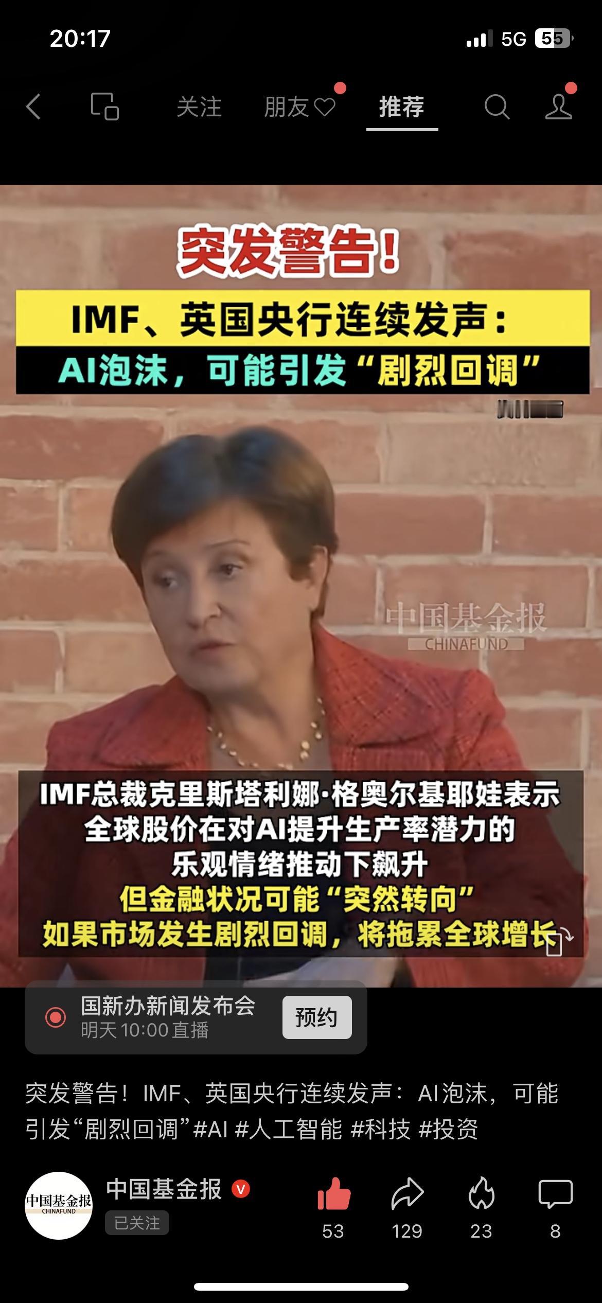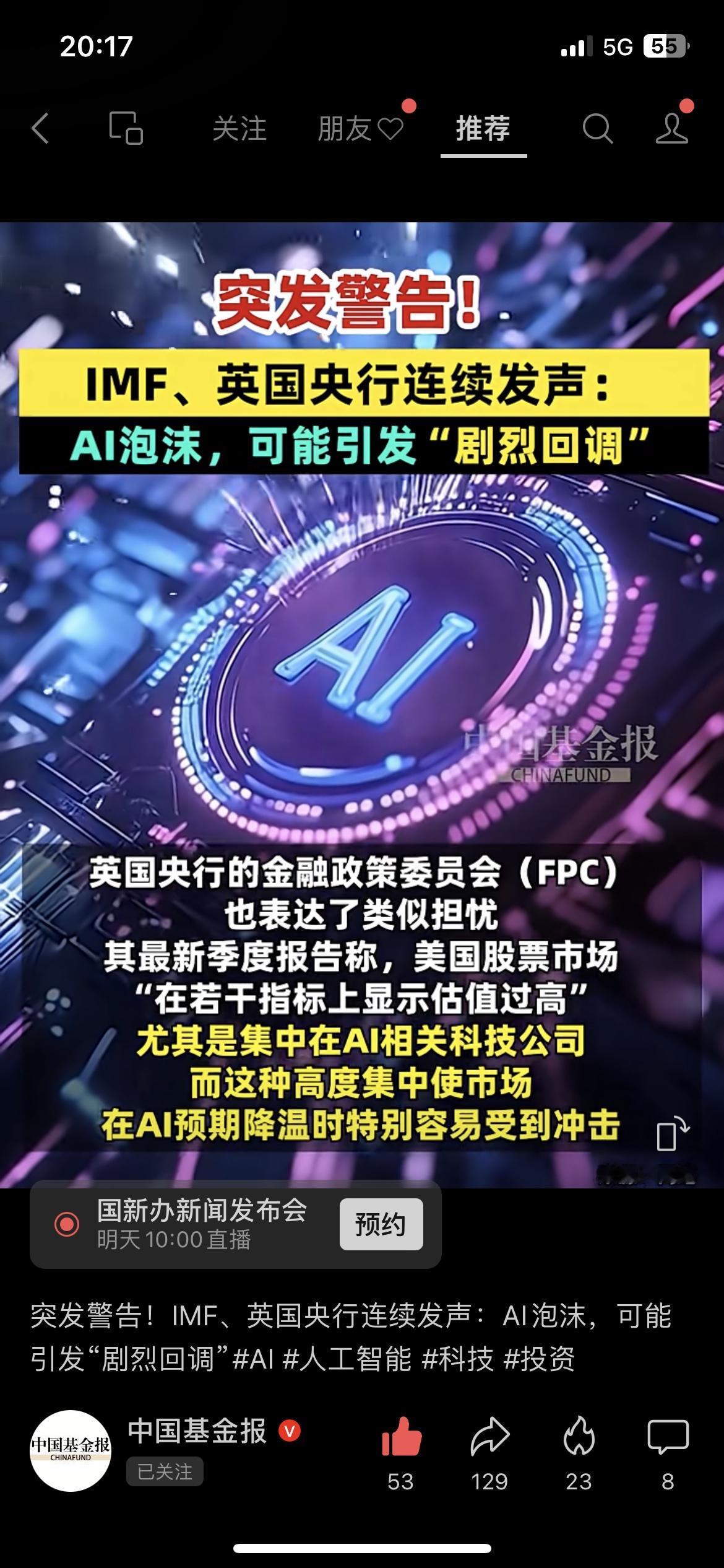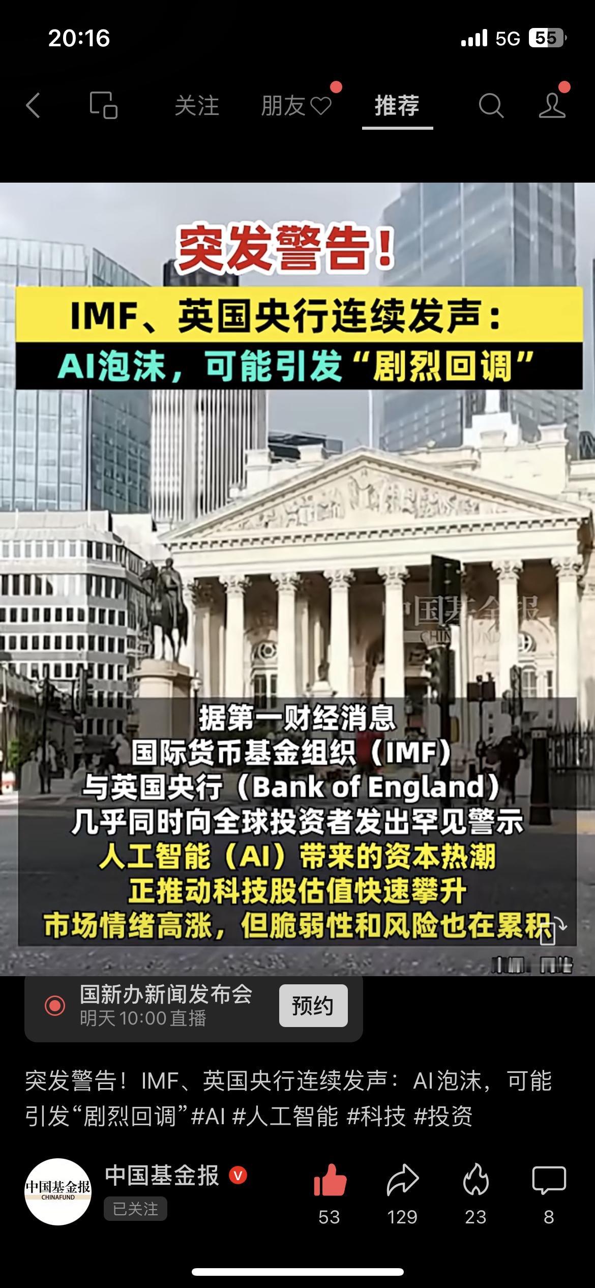 IMF和英国央行突然警告!AI泡沫要崩?这波操作太炸了 AI 行业分析 AI价值重估 AI市场分析 家人们快看!IMF和英国央行接连发声,说AI泡沫可能引发“剧烈回调”!意思就是AI相关的科技股估值可能崩了啊!这波警告来得猝不及防,你们觉得AI板块会咋走?快到评论区聊聊你的看法!