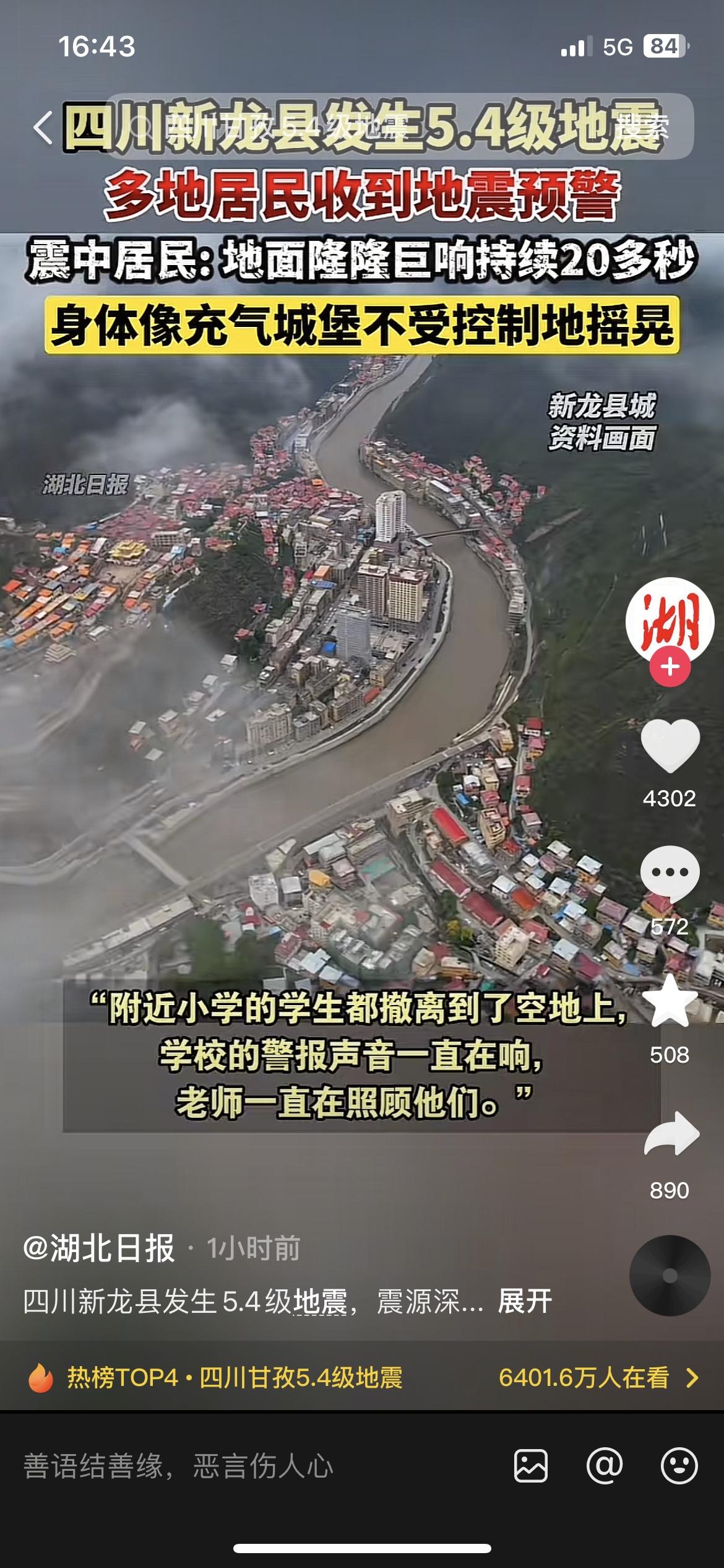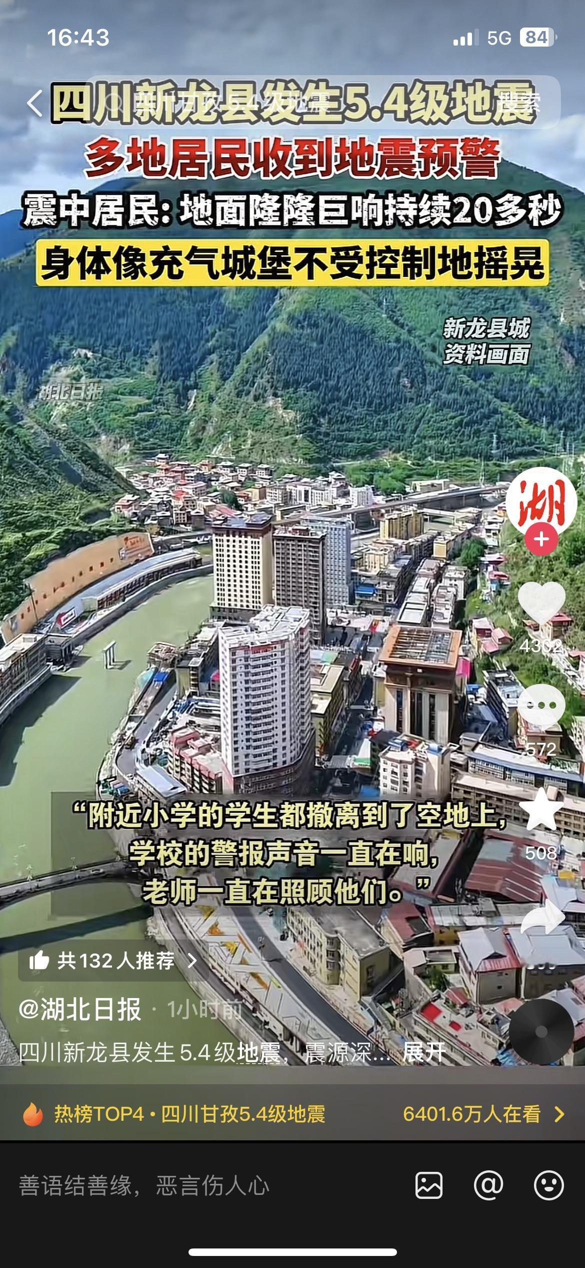 家人们!四川新龙县刚刚发生了5.4级地震!多地居民收到地震预警,震中居民称地面轰隆作响持续了20多秒,身体像在充气城堡上一样不受控制地晃动!学校里的学生都已撤到空地上,老师一直在一旁照看。你那里有震感吗?来评论区说说~