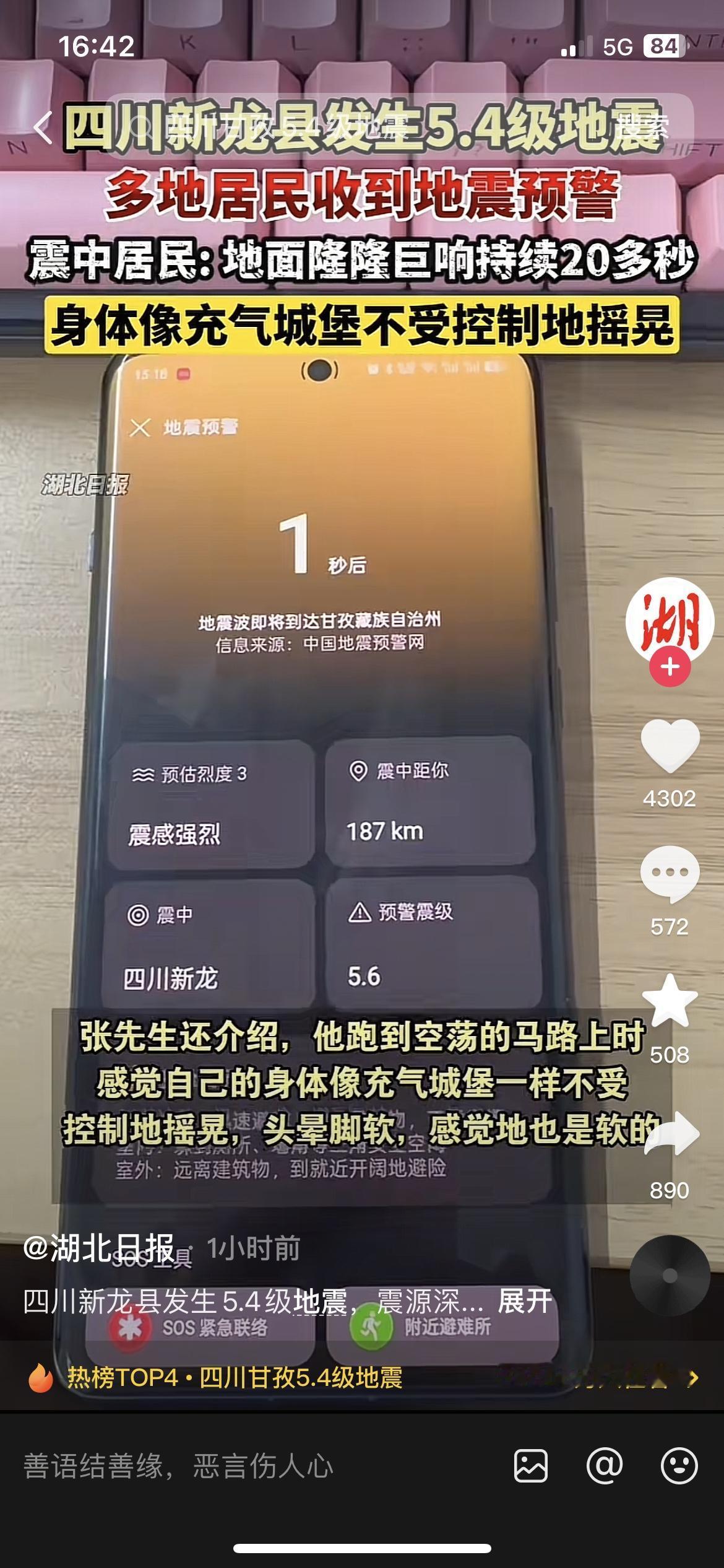 家人们!四川新龙县刚刚发生了5.4级地震!多地居民收到地震预警,震中居民称地面轰