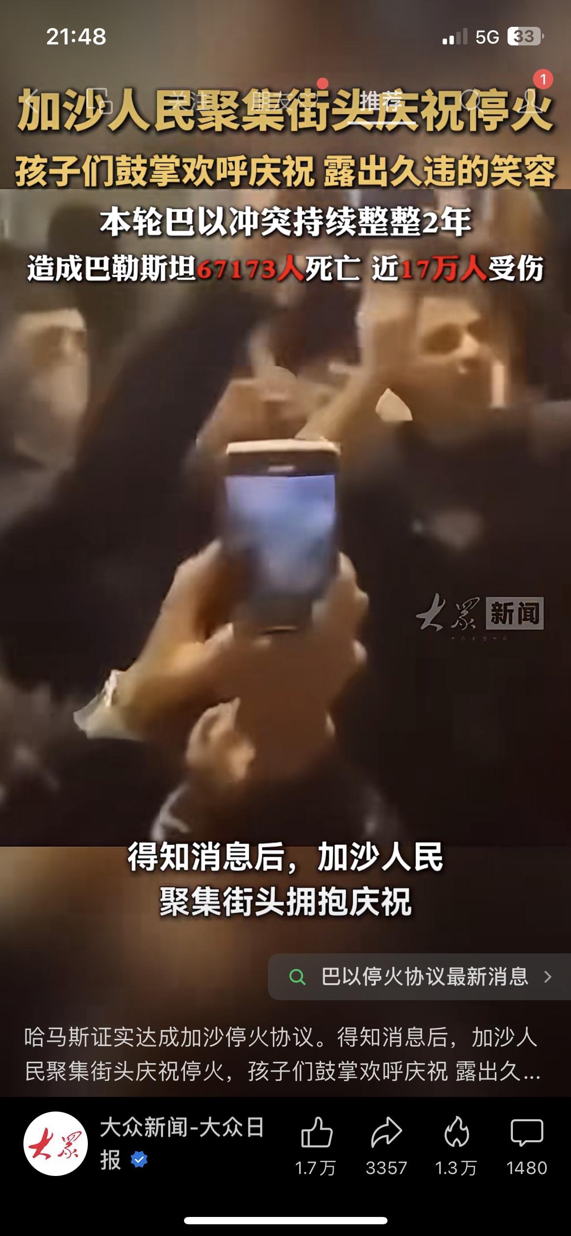 加沙停火!孩子们街头鼓掌欢呼露久违笑容,两年冲突致6.7万人死亡,这和平太让人泪目! 家人们!加沙停火了!街上的孩子们鼓掌欢呼,露出了好久不见的笑容。想想这两年巴以冲突,巴勒斯坦67173人死亡,近17万人受伤,现在终于等来停火,真的太不容易了。看到孩子们的笑容,你们觉得这和平能持续吗?来评论区说说你的想法~