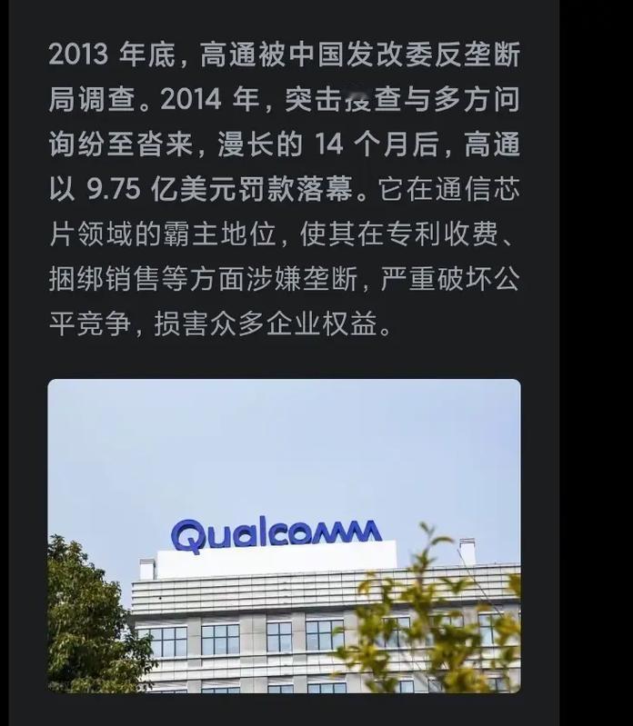 高通再因反垄断被查:10年两度亮剑,中国市场从不是“法外之地” 刚买的新手机里藏着“隐形成本”?你不知道的是,过去很长一段时间,国产手机每卖一台,都要给高通交一笔不菲的专利费——这可不是简单的技术分红,而是曾被诟病的“垄断税”。10月10日市场监管总局再放大招:因收购Autotalks公司未依法申报经营者集中,高通被正式立案调查,消息一出,其美股盘前直接下跌近3%。 这绝非高通第一次因垄断“栽跟头”。2015年那场历时15个月的调查还历历在目当时高通因收取高价专利费、搭售非必要专利等“三宗罪”,被开出60.88亿元的天价罚单,创下中国反垄断史上最高纪录。要知道,2013年高通全球营收的49%都来自中国市场,相当于从中国赚走的钱里,被迫退回了一大笔。如今卷土重来的调查,戳破了“巨头可以游走于规则之外”的幻想。 可能有人会问:“高通有技术优势,收点费不是应该的?”但垄断的可怕之处在于“越界”。早年高通不仅按手机整机价格收专利费,连过期专利都照收不误,还把芯片销售和专利许可强行捆绑——国产手机厂商要么忍气吞声交钱,要么就拿不到核心芯片。这种“店大欺客”的玩法,最终还是会转嫁到消费者身上,让大家为不合理的成本买单。 更值得深思的是,两次调查背后,是中国市场的两个关键变化。一方面,反垄断早已不是“一阵风”,从2015年剑指专利垄断,到如今紧盯经营者集中,执法越来越精准,这标志着我国反垄断能力在不断升级。另一方面,中国企业早已不是当年的“技术追随者”,华为海思等企业已能在芯片领域与高通同台竞技我们不再需要靠“出让市场换技术”,自然有底气对垄断说不。 高通的回应从“觉得罚款太重”到如今配合调查,态度的转变恰恰说明:中国市场欢迎真正的技术强者,但绝不纵容破坏规则的巨头。那些以为“大到不能管”的企业,终究会明白:这里的游戏规则从来不由某家公司定。 你用过的手机是高通芯片吗?对这种“巨头监管”你怎么看?来评论区聊聊~