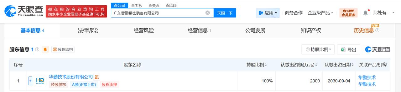 华勤技术在广东成立精密装备公司注册资本2000万 天眼查工商信息显示,近日,广东智勤精密装备有限公司成立,法定代表人为王仕超,注册资本2000万,经营范围含智能基础制造装备制造、智能基础制造装备销售、智能家庭消费设备制造、可穿戴智能设备制造、智能仪器仪表制造、电子专用设备制造、半导体器件专用设备制造等。股东信息显示,该公司由华勤技术全资持股。 天眼查信息: