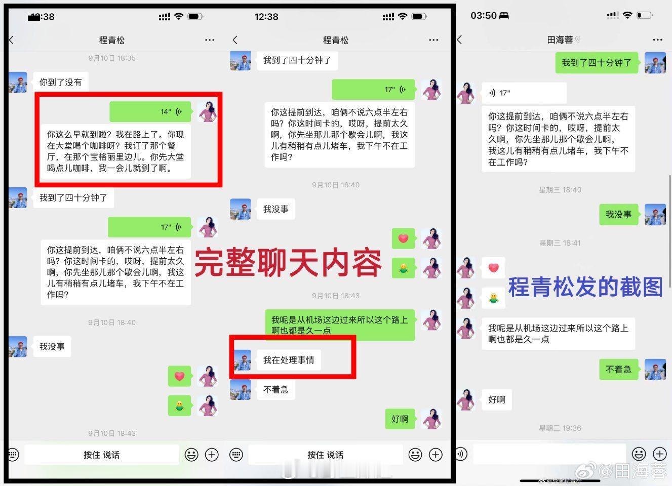 看了田海蓉新发的声明,越来越觉得程青松真的太老六了。自己有问题,就不顾其他人隐私擅自把人家的聊天抖出来转移视线洗白自己,而且还是删减版,删了的那句“我在处理事情”其实才最重要,处理的啥事?处理完了没?跟田吃完饭继续?这句信息量真的大。而且最重要的当晚的时间线田海蓉也大大方方都说清楚了,明确说自己不可能做程青松所谓的时间证人。所以这事儿说白了就是程青松自己不明不白非要拉人下水,看准了田海蓉平常不怎么上网不懂这些,一个劲儿带节奏,其心可诛!田海蓉公布和程青松完整聊天内容田海蓉称不可能是程青松的时间证人