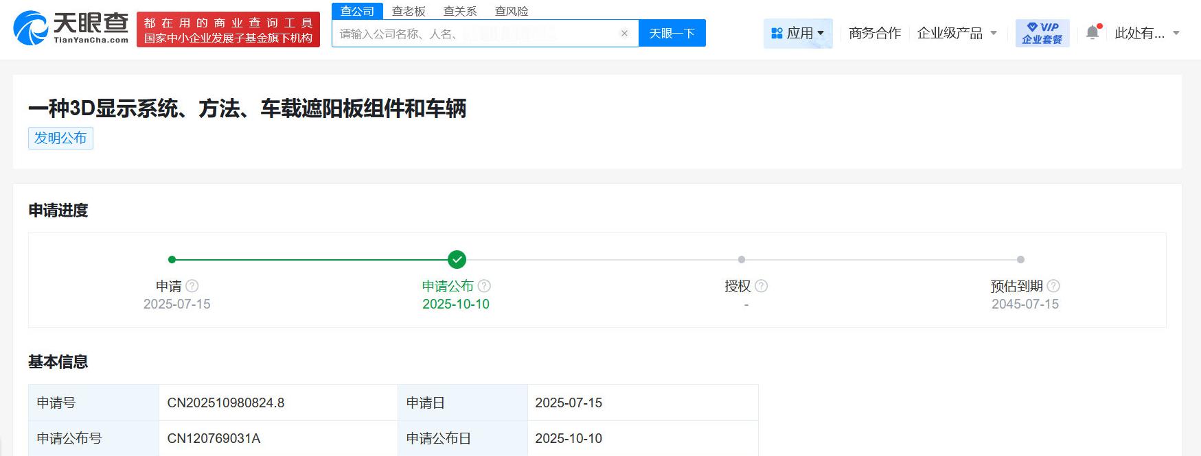 比亚迪公布裸眼3D成像专利 天眼查App信息显示,10月10日,比亚迪股份有限公司申请的 “一种3D显示系统、方法、车载遮阳板组件和车辆” 专利正式公布。