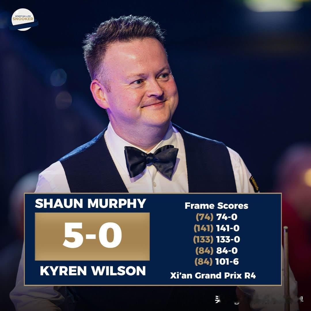 肖恩·墨菲对阵凯伦·威尔逊的连续得到533分,是历史上第三高的得分,仅次于罗尼·奥沙利文在2014年大师赛上对阵里奇·沃尔登的556分(仅用58分钟就拿下6-0),以及斯图尔特·宾汉姆在2016年中国公开赛上对阵萨姆·贝尔德的547分。 而凯伦·威尔逊仅有的6分还是来自墨菲的犯规所得,所以他整场比赛甚至没有进一个球。 五局得分: 墨菲74-0威尔逊 墨菲141-0威尔逊 墨菲133-0威尔逊 墨菲84-0威尔逊 墨菲101-6威尔逊