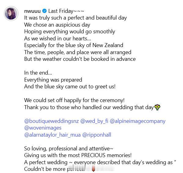胡定欣之后再出帖文,照片中的胡定欣在酒店准备,见到枱上有梳妆用品,胡定欣一身家居装估计只是整好妆容,但未换婚纱。胡定欣以英文留言:“上周五,真是完美美好的一天,我们选择的吉日,希望一切顺利。如愿以偿,尤其感谢新西兰的蓝天白云,时间、人物、地点都安排好了,但天气却无法提前预约。”