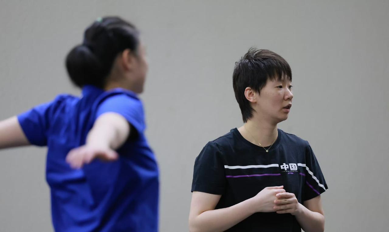 10月10日王曼昱训练照 昨日各协会、各球员已经投入到赛前备战场地适应阶段。 国乒方面,任浩教练亲临现场,徐奕全程陪练,二人共同为王曼昱保驾护航。