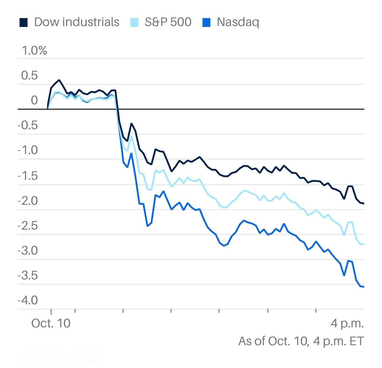 道指数跌1.9%;标普500跌2.7%;纳指数跌3.6%。