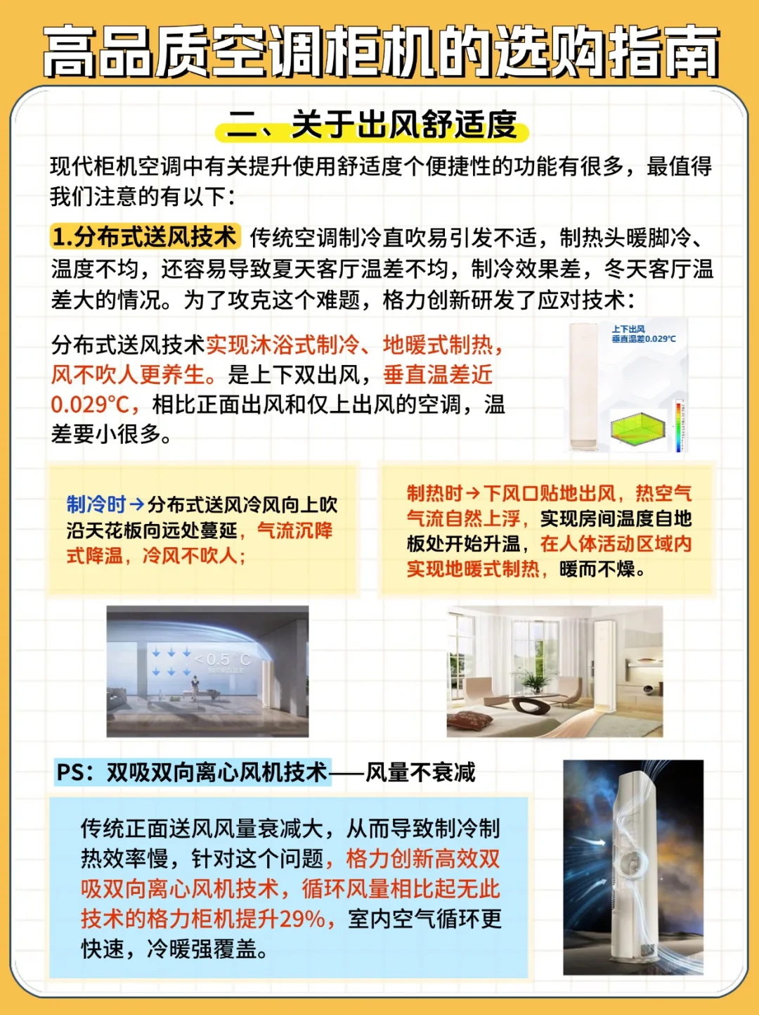 1️⃣创新分布式送风技术,风不吹人更养生。沐浴式制冷,冷风向上吹,自然下沉降温,避免冷风直吹感冒;地暖式制热,暖风从上下两个风口同时吹出,贴地暖流从脚起,衡温舒适。