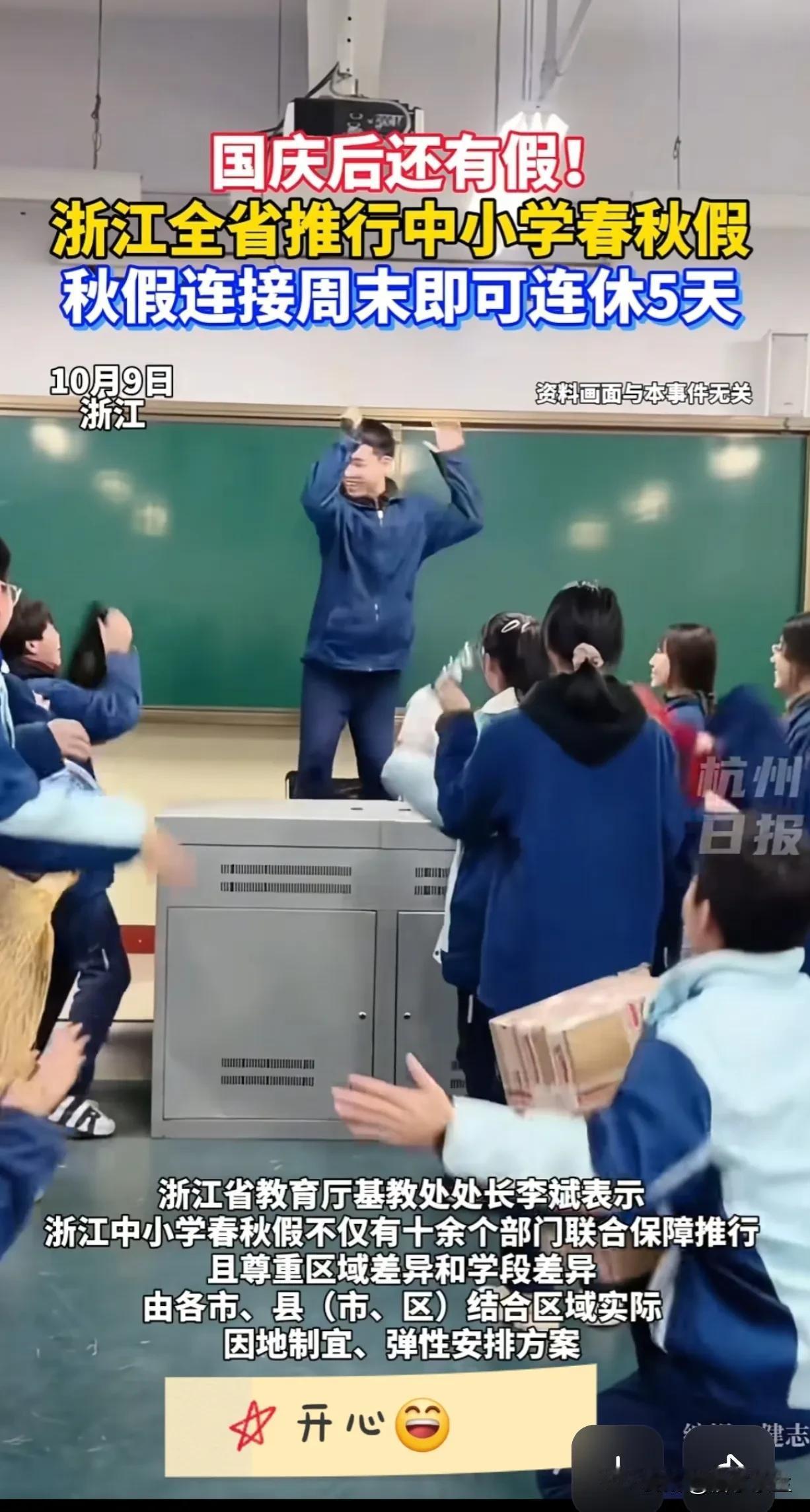 浙江中小学春秋假各3天!家长却愁坏了:谁来带娃? 5天连休模式全国推广?但调查显示68%双职工家庭无法陪同,校外托管机构价格暴涨50%。教育部门回应:将试点"弹性工作制+校内托管",你支持春秋假吗?