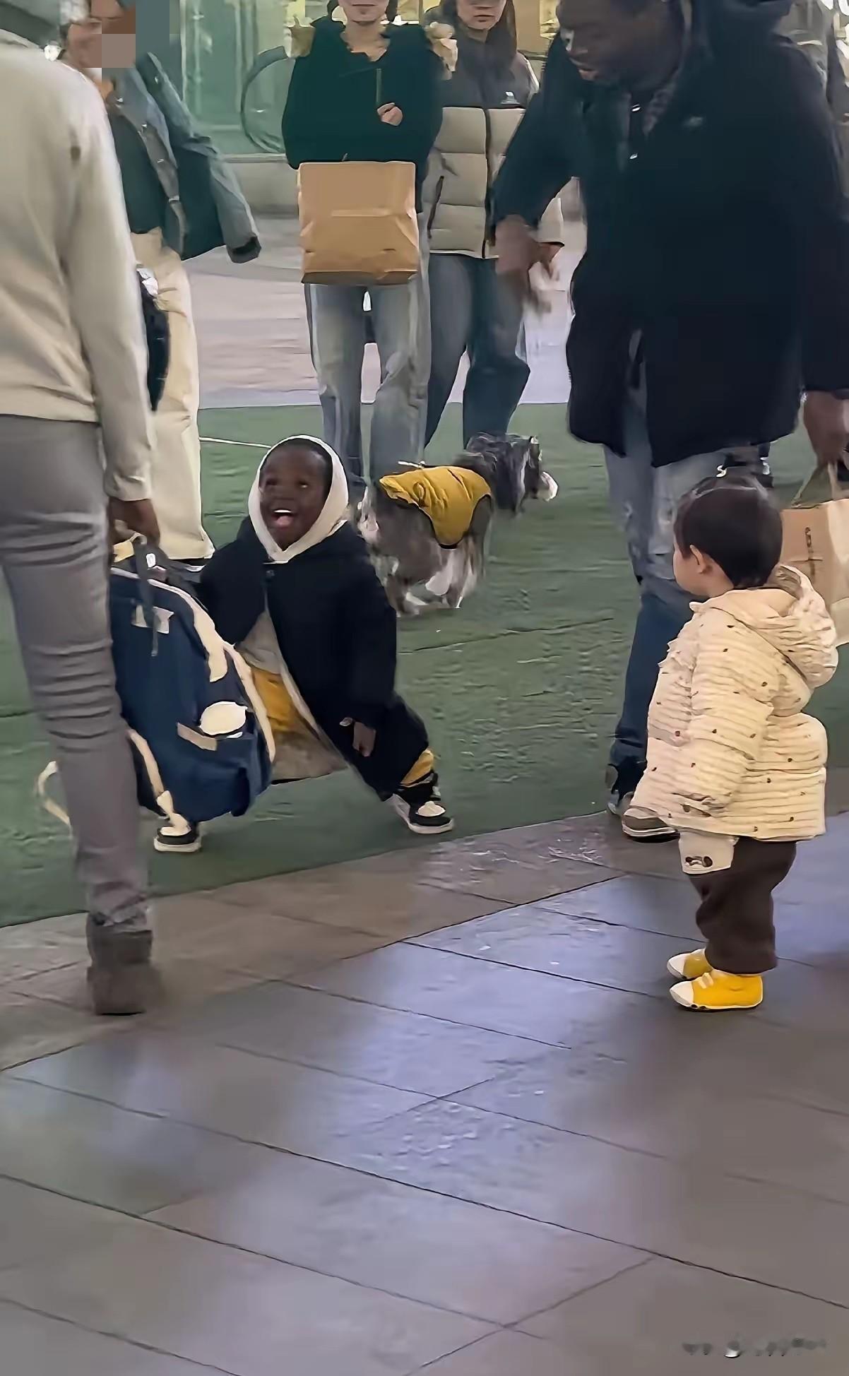 公园里遇到一对黑人夫妻带着自己的黑小孩,看到中国小宝宝之后,黑小孩非常的兴奋,因