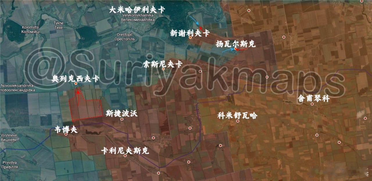 4、大米哈伊利夫卡:俄军巩固了最近在奥列克西夫卡以南夺取的阵地。此外,俄军与乌克兰军队在新谢利夫卡和扬瓦尔斯克的战斗仍在继续。