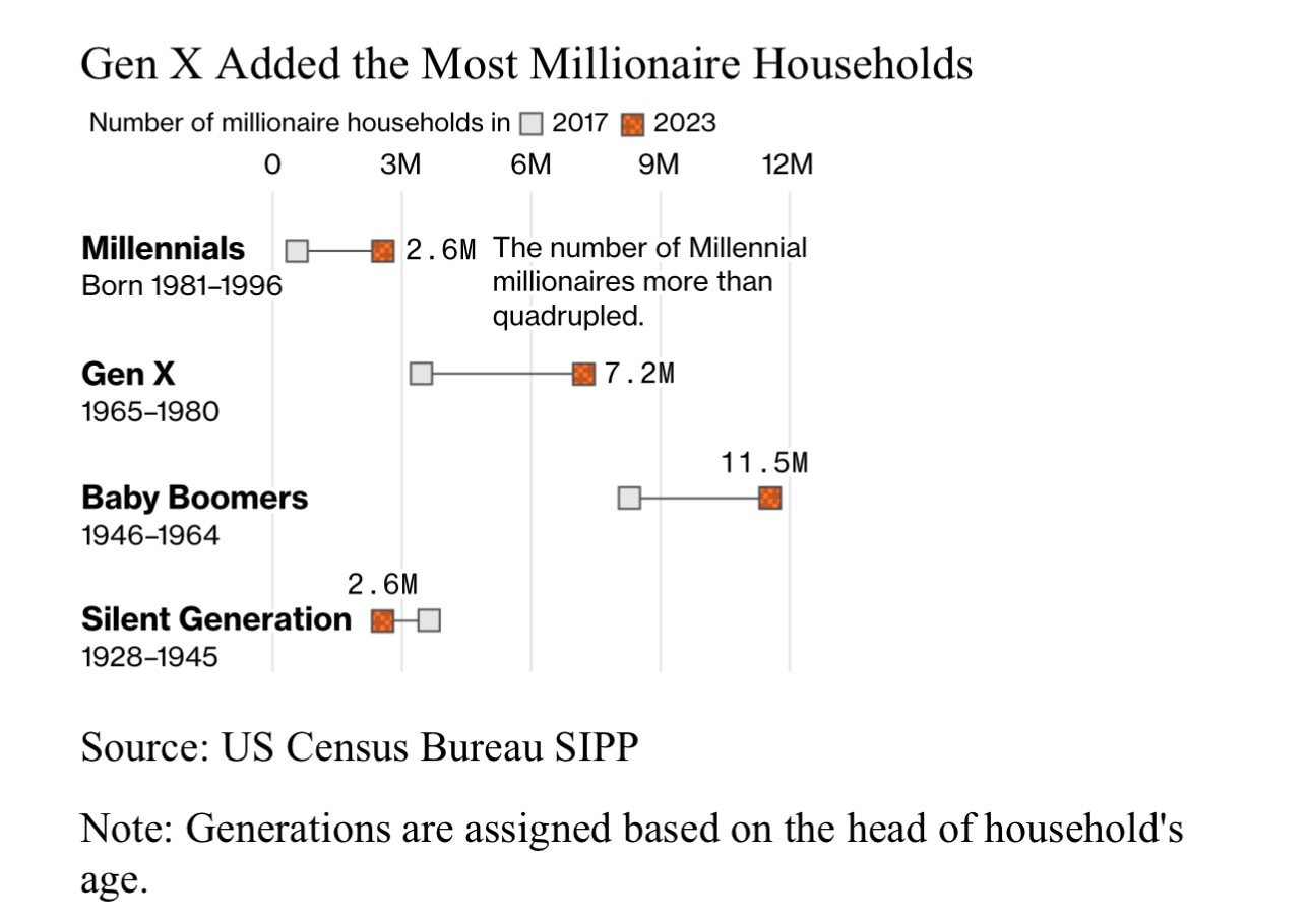 不同世代的百万富翁在数量和财富分布上也存在巨大差异。只有1946年前出生的百万富翁数量正在减少,因为“沉默的一代”逐渐凋零。