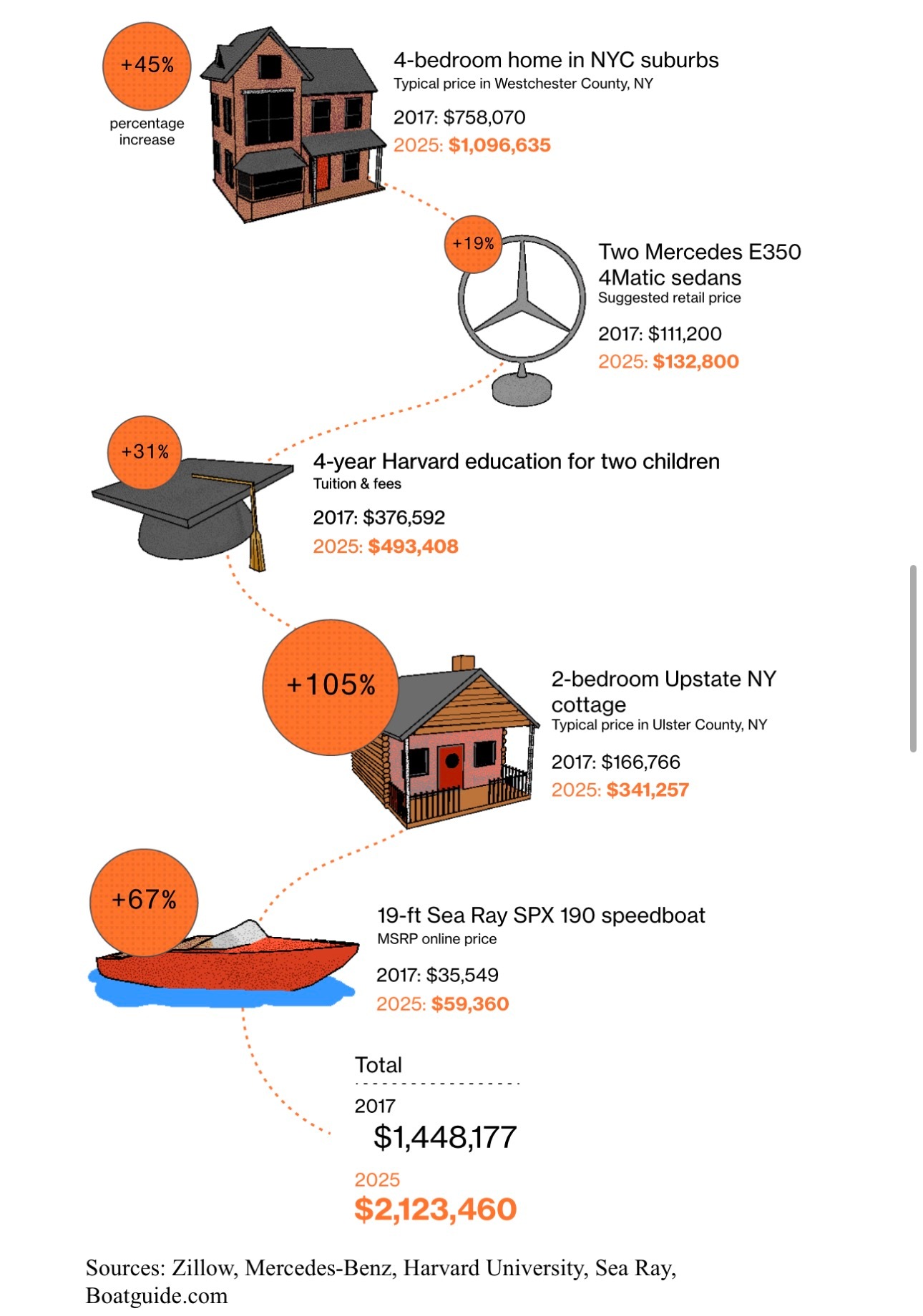 为了说明这种变化,可以看看在纽约一个富裕家庭的典型生活成本:一栋四居室住宅、两辆全新的梅赛德斯轿车、两个孩子在常春藤盟校就读、一处州北部的小型度假屋,以及一艘19英尺(约5.8米)的快艇。不到十年前,这样的生活成本约为140万美元,而到2023年,同样的配置已需210万美元。
