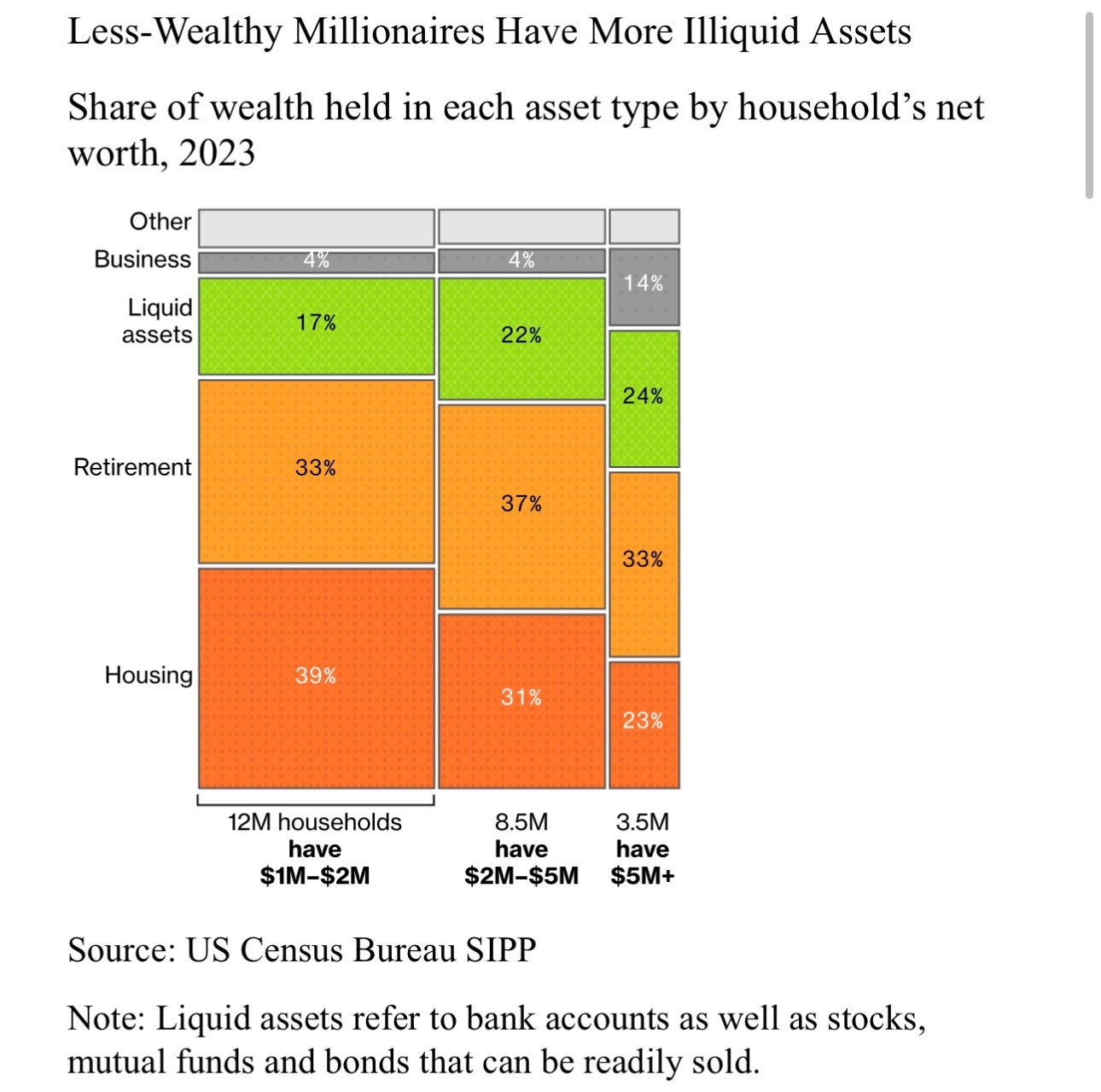 越来越多百万富翁的财富被锁定在难以快速变现的资产中,例如住房净值,或日益增多的受年龄限制的退休账户资产,如401(k)和IRA账户。