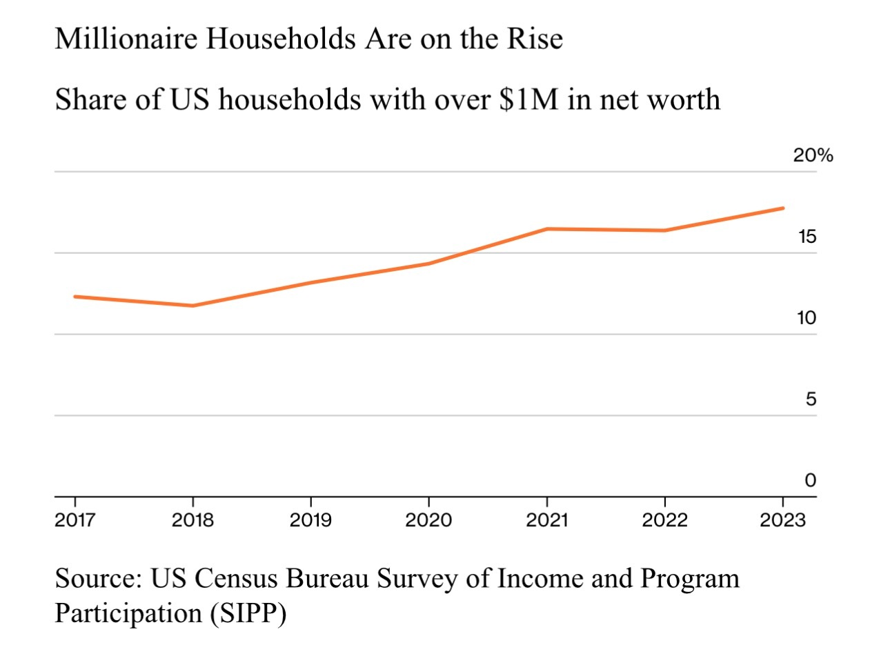 如今,美国百万富翁家庭的数量已超过2400万户,几乎占到美国全部家庭的五分之一。彭博基于截至2023年的政府调查数据分析,发现其中有三分之一的现代百万富翁是在2017年之后才出现的,得益于房价飙升和股市上涨。