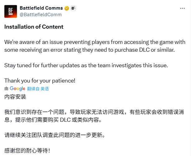 官方《战地》社交账号在推文中确认了该问题,称部分玩家在尝试访问游戏时会收到“需要购买DLC或类似内容”的错误信息。团队正在调查并将发布进一步更新。