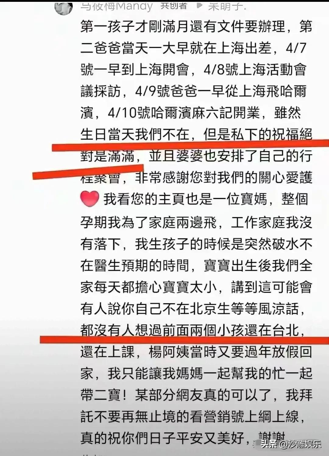 关于为什么不能回北京给婆婆过生日,马筱梅的解释是:签证没那么好办,尤其是汪宝儿的文件,必须全部办理妥当才能带着孩子回去。至于汪小菲为什么不去,她把老公7号到10号的行程公开了,意思是“不是不去,是真的有安排”。她强调,私下里大家都有祝福张兰。