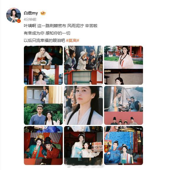 白鹿莫离九宫格杀青plog白鹿发了好多莫离杀青合照 plog 记录感动瞬间!手摸 “叶璃” 花墙字,与主创拥抱,不舍全写在脸上。