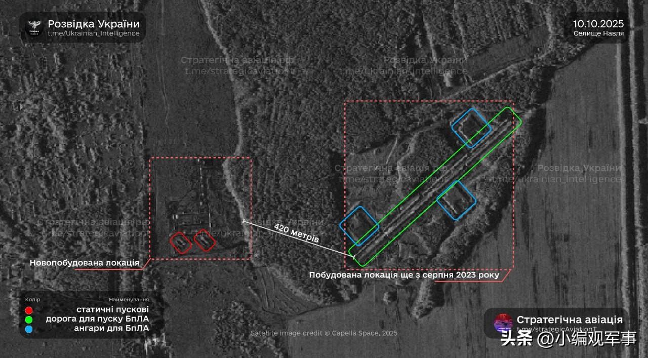 10月10日的新合成孔径雷达(SAR)卫星图显示,俄罗斯继续扩建位于布良斯克州的纳夫利亚训练场,该训练场用于发射“天竺葵-2”和“天竺葵-3”无人机。 此前,无人机发射仅在发射车上进行,所有无人机都存放在三个地下掩体中(每个掩体大约可存放200架无人机)。在主要发射区西侧已建成了地面固定发射器,这种发射方式发射无人机所需时间和资源更少。 虽然这次扩建似乎尚未完成,但我们很可能在不久就能看到从这里发射的无人机数量增加。 俄乌局势