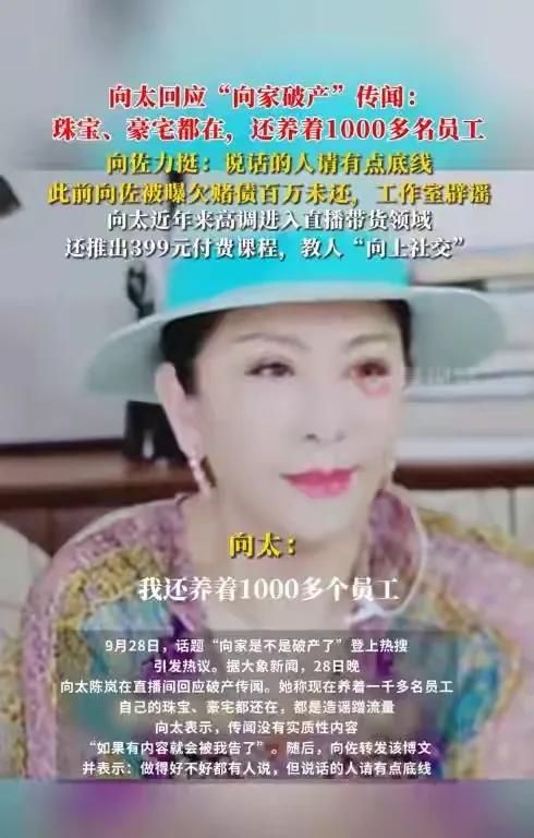 又是直播,又是卖包包,向家是不是真的要破产了? 近日关于向家破产的言论在网上引起热议,其实出现这样的言论并不是空穴来风。 向家这么大的家业,这么厚的资本,一般人估计早就安安稳稳过日子享受生活了。但是向太却反其道而行之,经常在网上直播卖货。 不仅卖化妆品、包包甚至还向网友推荐买自己的课程,叫别人如何混进高质量的圈子,券后399。 这样的情况也难免会引起人们的议论。 之所以会言论说向家要破产了,或许也跟向佐的一些消息有关。 之前就有消息传出说向佐赌博欠了180万没还,在网上被炒的沸沸扬扬。好在最后被证明这事跟向佐无关,是别人利用他的名义借的。 后来向佐又多次尝试赛道,但效果都不是很乐观,现在他也搞起了直播卖货。 现在网上的传言再起,向太忍不住发声,人家还有豪宅,还有上千名员工养着。 这样的发言让网络上的传言不攻自破。各人有各人的活法,谁都不会嫌自家钱多,在网络时代,能赚钱是自己的本事。 网上说向佐家要破产了,此事你怎么看呢? 本文信息来源:【杭州日报】【搜狐娱乐】【向太个人账号】【郭碧婷个人账号】