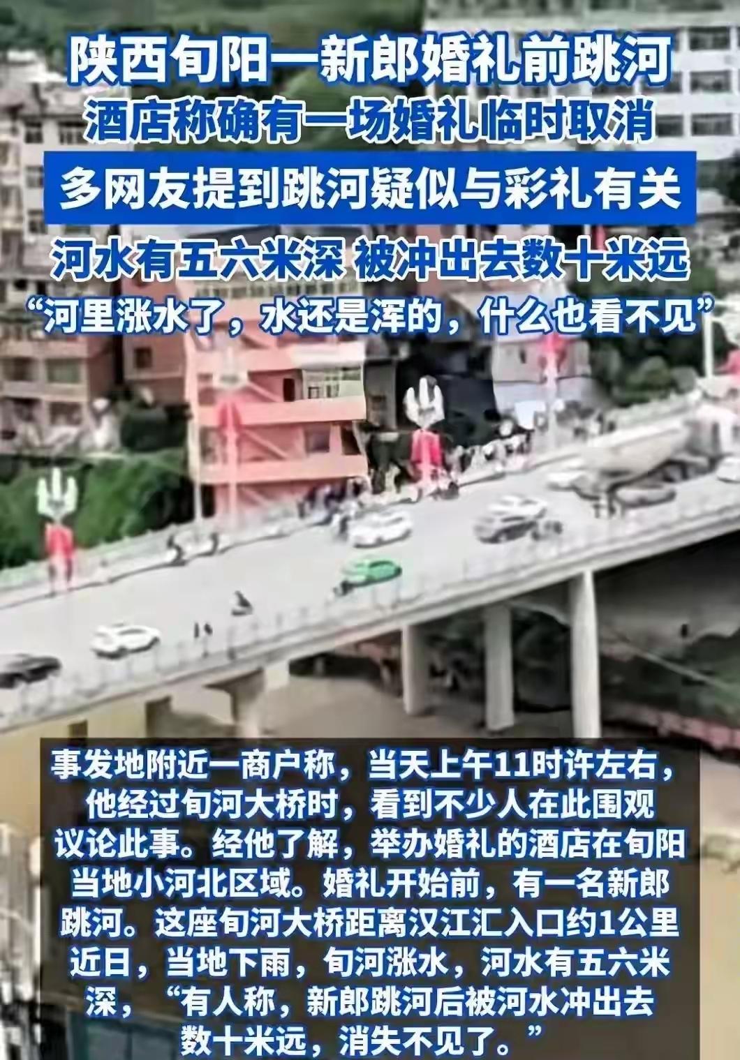 陕西旬阳婚礼当天跳河男子周某某的尸体找到了,没有奇迹发生,逝者已逝,一场喜事却成了悲剧,真是令人惋惜! 事情发生在10月3日,陕西旬阳,一个酒店里喜气洋洋,周某某的亲朋好友都欢聚一起,参加他的婚宴。然而他们怎么也想不到,竟然悲剧就在路上。 网上传的很多,说是因为临时加了2万元的彩礼导致的,这种说法已经被辟谣了。 有人说,其实在婚车上两人就一直在争吵,具体在吵什么并不知道。 到了酒店估计还是很多问题两个人没有处理好,如果这个时候两人停止不愉快的情绪,也许就不会发生后面的悲剧。 然而,周某某还是没有承受住种种原因下的压力,竟然跑出酒店,没有任何犹豫跳下去了。 那几天旬阳正下雨,河水很大很湍急,本身河也深,有五六米。周某某跳下去后,很快被冲到远处,没了踪影。 如今尸体被找到了,但是这事给他的父母带去的痛苦这一辈子都难弥补,白发人送黑发人,人间最痛之一。 这件事很值得深思,爱情不是金钱交易,婚姻也不少靠彩礼多少来衡量。真心相爱的人,决定要走进婚姻殿堂,就应该多多包容和理解彼此。陕西新郎跳河