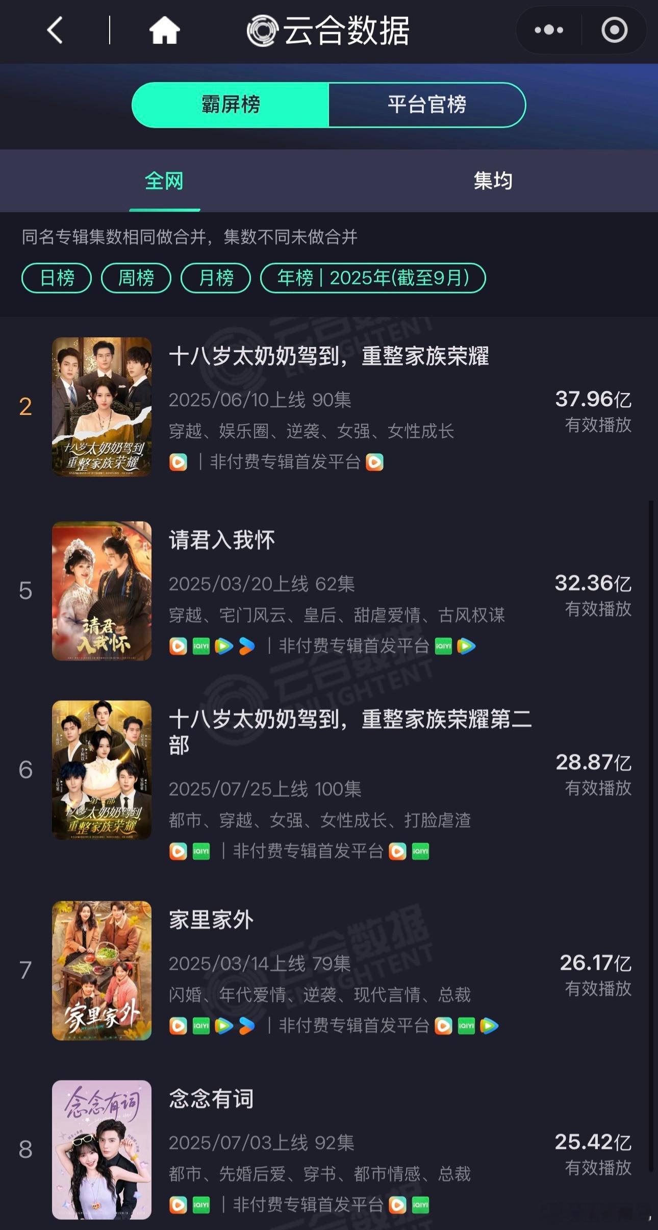 盘点了一下2025前Q3的短剧云合数据,发现听花岛前十占了五个。