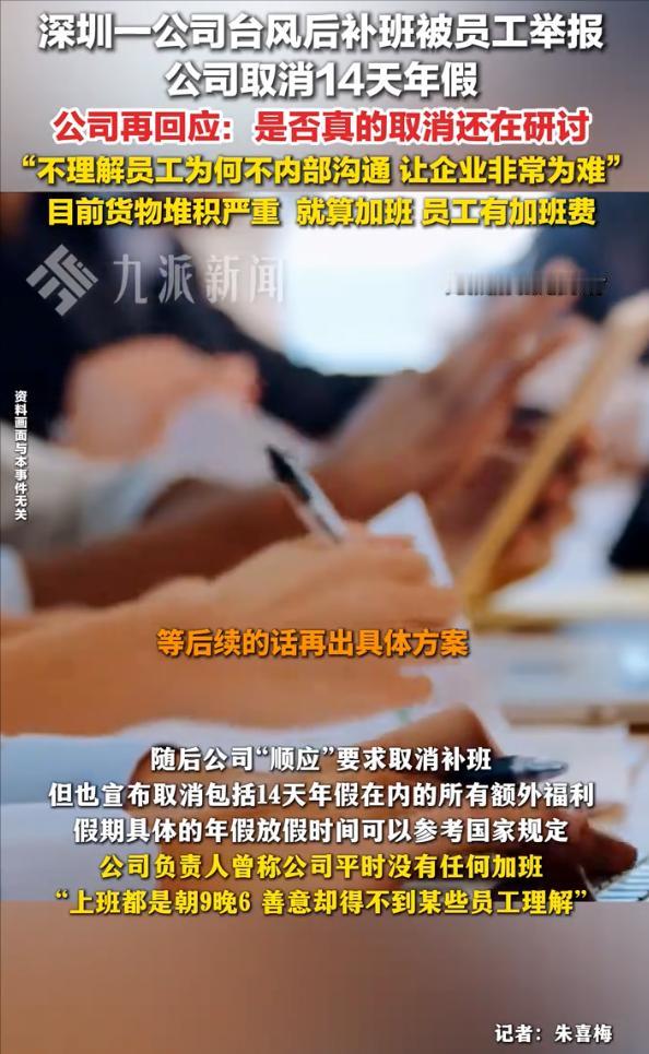 私企的管理就是这么人性化,不放假也不行,放假放少了也不行。因台风桦加沙影响深圳市疆拓商贸有限公司运营,疆拓公司欲9月27日调班一天,一员工遂向劳动局举报。疆拓公司无奈决定9月27日还是放假,但却赌气的取消了14天年假及额外假期,按法定假期来。 疆拓公司这个取消假期福利的政策,一下就动了所有员工的奶酪,纷纷举报。9月29日疆拓公司无奈暂停此政策的实施,称是否真的取消还在研讨。 因为这次国庆假期8天,如果再加上14天年假,这对于已经安排好22天假期的员工来讲,影响无疑是巨大的。
