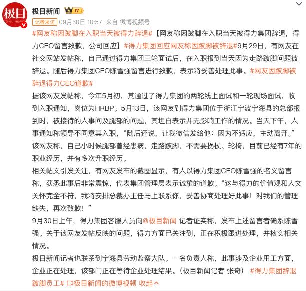 去奖励那些支持跛脚的公司吧!不要来称赞辞退跛脚的得力道歉的及时,处置的及时了。 因跛脚入职当天就被得力辞退,4个月后才敢来发帖吐槽一下,刚一发帖吐槽,就及时的得到了得力的道歉,得力的及时性在公关上体现的无比淋漓尽致。 还让让我们去奖励一下,曾入职的更多的那些给予跛脚的人以支持的那些公司,他们才是无名英雄。