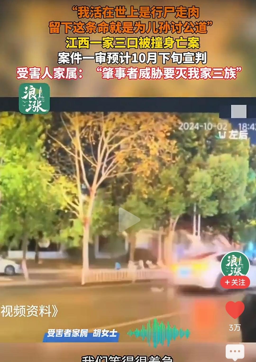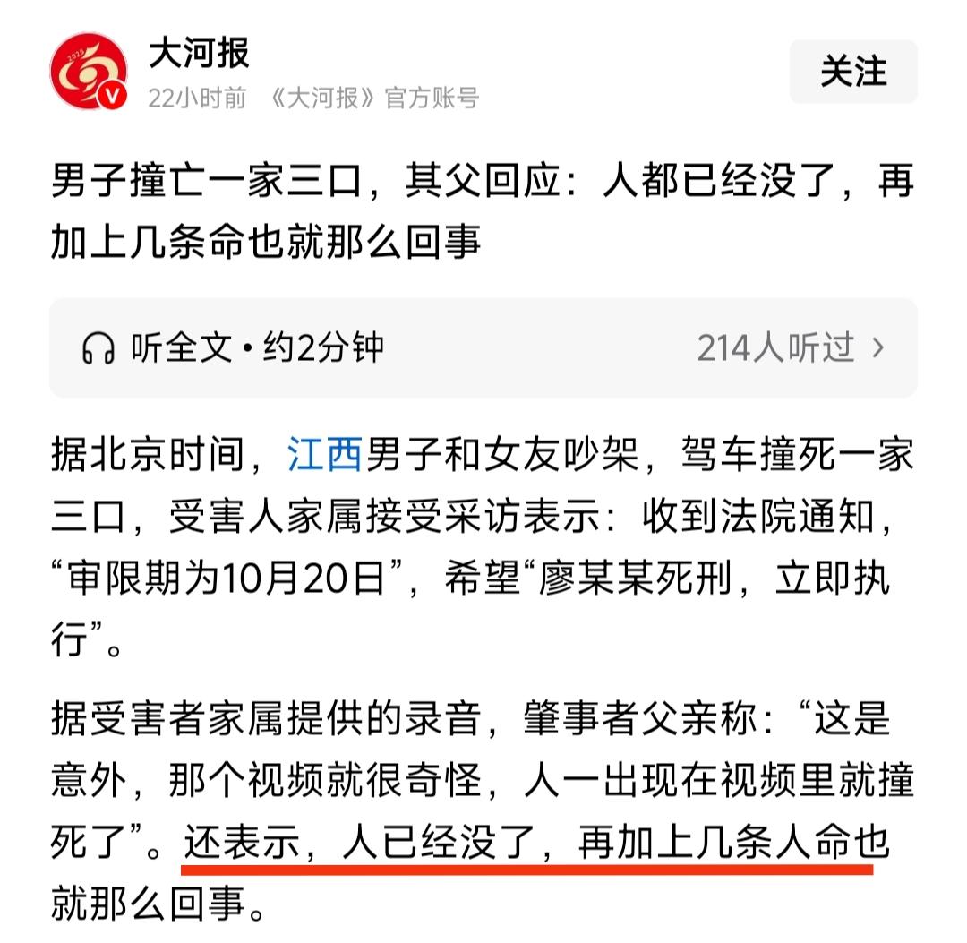 “这是意外,人已经没了,再加上几条人命也就那么回事”! 这是撞死他人肇事者的父亲说的话!你看看这说的话是人话吗?这话谁听了不气! 2024年10月在江西景德镇发生了一起严重的车祸。驾驶人廖某某因为与女朋友吵架,心中不愉快,驾车过程中车速飞快达到近130码。 这样的车速在一般道路上绝对是非常危险的。此时一家三口正在正常行走,却被瞬间撞飞,一个家庭就这样被毁了! 事后受害者家庭悲痛欲绝,父母因此患上了严重的抑郁症! 而肇事者家庭却通过中间人表示,想80万赔偿了结此事,但被受害者家庭拒绝。 是啊,哪个家庭能接受这样的事情呢,一个好好的家,因为别人的不愉快而没了,而肇事者家庭还说出如此冷漠的话,等于伤口撒盐,无论如何是接受不了的。 目前受害者家庭只希望肇事者被判死刑立即执行。 这件事确实是个悲剧,最令人气的就是肇事者撞人后不是第一时间报警,而是先扶自己女朋友,然后点根烟站一边抽烟去了。 父母爱子可以理解,但孩子酿成如此大祸还想偏袒,甚至出口伤人就过分了!江西撞死三人案