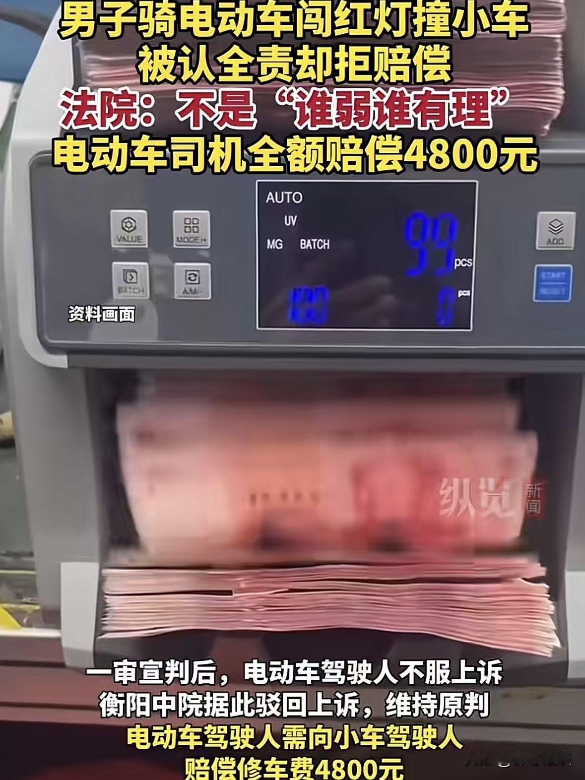湖南衡阳,一外卖小哥在配送途中闯红灯,与正常行驶的宝马车发生碰撞,交警调查后认定外卖小哥全责。随后宝马车被送至4S店定损,维修费用为4800元。面对赔偿要求,外卖小哥却不同意,他称自己是弱势群体,而且没有法律规定说非机动车需赔偿机动车损失,所以拒绝赔偿,双方就赔偿金额与责任归属无法达成一致,协商陷入僵局。最后法院这样判了! 刘航是一名外卖员,每天赶上饭口的时间点都忙的不行。 今天路上还格外的堵,眼看配送时间就要到了,他急的不行。 这工作就配送时间卡得紧,多耽误一分钟可能就差评、扣钱。 刘航到了路口又赶上红灯,一抬头得90秒,他心一横,过去算了,反正车也不多。 骑车就直接就冲了过去,好巧不巧正好有辆宝马车在正常绿灯行驶,俩车一下子就撞上了。 一时间周围的人全都围了过来,刘航没有受伤,但估计也吓得够呛,电动车倒了,外卖撒了一地。 在看宝马车的保险杠碎裂、左前翼子板凹陷。 因为是红灯,大家都议论刘航,小伙子那么着急干啥,这得亏没事,要是把你撞坏了可咋整。 没一会,交警就到了,调监控、问情况,最后出的责任认定书特别明确: 刘航骑电动车闯红灯,违反交通规则,承担全部责任。 白纸黑字的结论,让刘航原本还想辩解的话,一下子堵在了喉咙里。 接下来的定损,更是让刘航慌了神,宝马车主将车开到4S店,工作人员拆开保险杠检查,最后给出的维修报价是4800元。 这个数说多不多,说少也不少,对于普通上班族来说,可能是大半个月工资。 更别说刘航了,做为骑手每天风吹日晒跑单,赚的都是辛苦钱。 刘航拿着定损单,直接就不乐意了,他说自己是弱势群体,送外卖本来就不容易,没有那么多钱。 而且也没听说过法律规定非机动车要赔机动车的损失,所以这4800块钱,他不用赔。 宝马车主一听都气乐了,合着他闯红灯还有理了。 自己正常开车没违规,平白无故被撞了,修车钱还得自己掏? 这肯定不答应,俩人就这么吵了起来,从一开始的协商变成了互相争执,你说你的理,我说我的理,谁也不让谁。 对此有人说小哥不容易,让车主少要点。 也有人说规矩就是规矩,闯红灯就得担责,总不能让守规矩的人吃亏。 就这么着,协商彻底陷入僵局,谁也没说服谁,最后双方闹上法庭。 刘航说自己是弱势群体,那遵守交通规则,是每个交通参与者的义务。 《道路交通安全法》第76条:机动车与非机动车驾驶人之间发生交通事故,若非机动车驾驶人有过错,根据过错程度适当减轻机动车一方的赔偿责任,但如果机动车一方没有过错,非机动车驾驶人就要承担全部赔偿责任。 简单说,不是非机动车不用赔,而是谁违规谁担责。 刘航闯红灯违反规则,导致宝马车辆受损,人家正常行驶没有任何过错,那维修费用自然该由刘航承担。 4S店是正规机构,定损流程和报价都符合规定,4800元的费用合理合法,不存在漫天要价的情况。 因此,一审法院经审理后认为,根据事故责任认定书,可以确定刘某是全责,宝马车主无责。 对此,刘航觉得自己就是个外卖员,辛辛苦苦跑半个月也挣不来4800元,自己也不是故意穿红灯。 而且宝马车找的4s店维修贵,要是找其他的维修店肯定没有那么多钱。 所以对一审的审判结果他表示不服,又提起了上诉。 二审法院经审理认为,现有证据已清晰还原案件事实: 《民法典》第1165条:行为人因过错侵害他人民事权益,应当承担侵权责任。 刘航骑行非机动车时违反交通信号灯通行,与宝马车发生碰撞。 且交警部门此前已作出刘航负事故全部责任的认定,案件事实不存在争议。 关于刘航主张机动车一方应承担不高于10%责任的说法,法院明确指出该条款存在适用前提,需机动车驾驶人存在一般过失行为。 而宝马车主在驾驶期间严格遵守交通规则,无任何操作不当或违规行为,完全不存在过失,不符合10%责任的适用。 因此宝马车主无需对刘航承担任何赔偿责任。 综上所述,二审法院驳回刘航的上诉请求,维持一审原判。 话说回来,与其说是外卖小哥赔不起,不如说是规则意识不能少。 这件事就像一面镜子,照出了很多人心里的侥幸:觉得我赶时间,闯个红灯没事,觉得我是弱势,出了事别人得让着我。 可马路上的危险,可不会因为赶时间就消失,法律的公平,也不会因为弱势就倾斜。 对此,你怎么看这件事呢? @静心法谈 学法辨是非,慬法不吃亏。