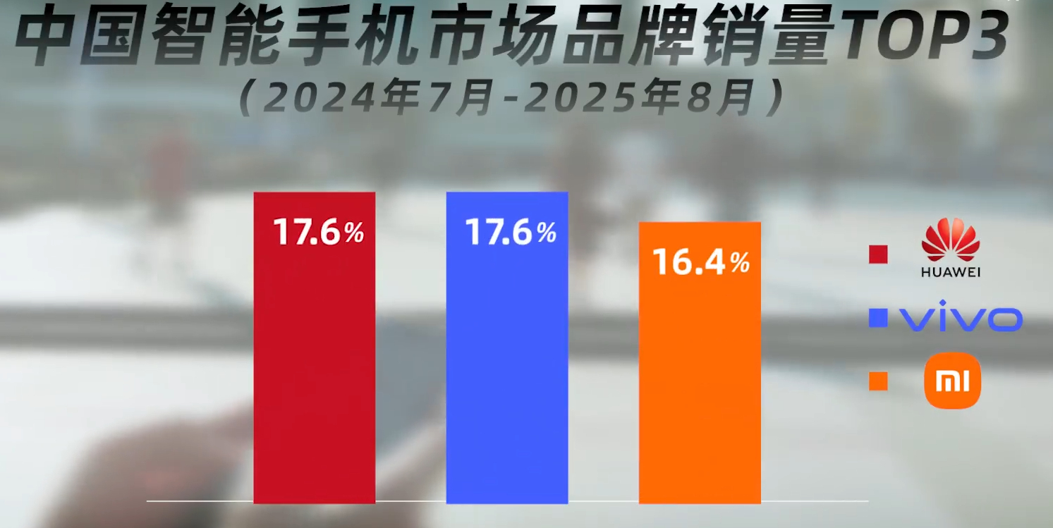2024 年还是vivo拿了第一,华为紧随其后,增长速度特别快。到 2025 年前三季度,vivo 依然稳在第一,紧接着是小米华为,不过前三名的差距都很小,也就零点几个百分点。