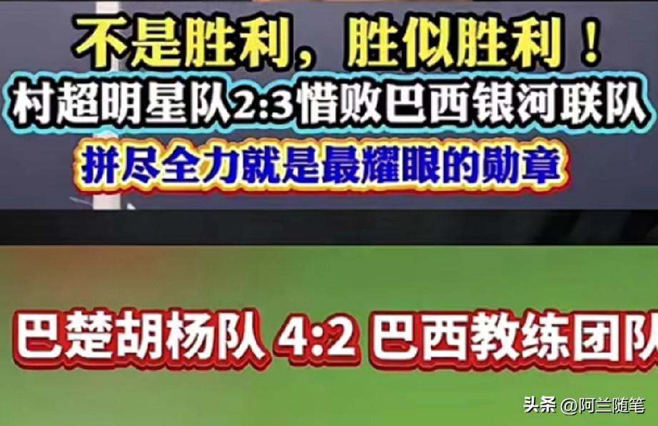 前几天巴西银河联队3:2险胜贵州村超全明星,现在新疆胡杨队4:2战胜了巴西银河联队。我看太多营销号跟疯了一样,说巴西队教练都急了,在场边狂喊“大家别大意,这不是国家队”,这说得也太夸张了吧。 我也不是什么球迷,但在我印象里,只要带了“巴西”两个字,再加上他们穿的类似巴西国家队的衣服,感觉就不一样。有没有专业的球迷,尤其是专业评球的出来讲讲,巴西银河联队到底是个什么水平?给我们这些伪球迷也科普一下。 如果把中国男足和这个巴西银河联队约一场,也不用什么正式的场地,随便找个学校的场子踢一场,看看咱们这个国字头的球队到底是个什么成色。要是能赢了这支巴西银河联队,我就当队员们的鲍鱼海参没白吃;要是赢不了,那真该好好反思了。