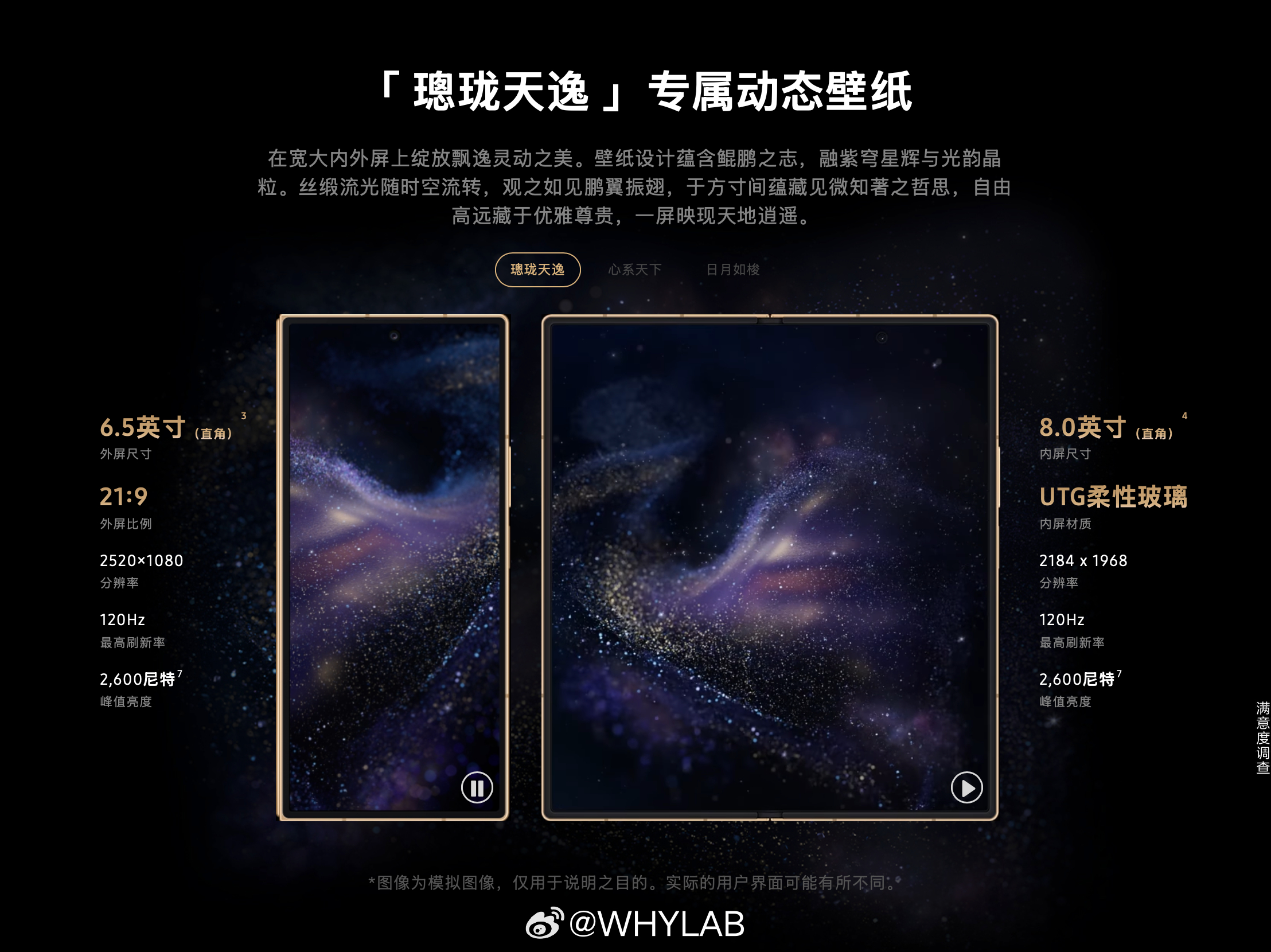 - 外屏:6.5 英寸 2520×1080 第二代动态 AMOLED,局部峰值亮度 2600nit,120Hz 刷新率(1-120Hz LTPO),康宁大猩猩玻璃陶瓷 2;