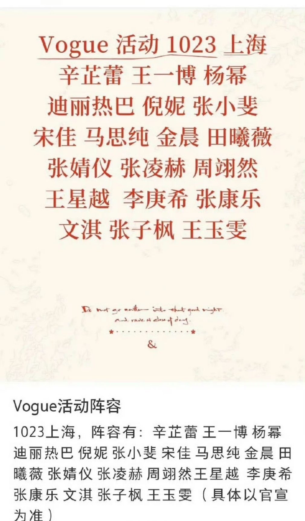 网传VOGUE盛典嘉宾名单:辛芷蕾、王一博、杨幂、迪丽热巴、倪妮、宋佳、马思纯、张小斐、金晨、田曦薇、张婧仪、张凌赫、周翊然、王星越、李庚希、张康乐、文淇、张子枫、王玉雯等 VOGUE盛典52位嘉宾 VOGUE盛典嘉宾