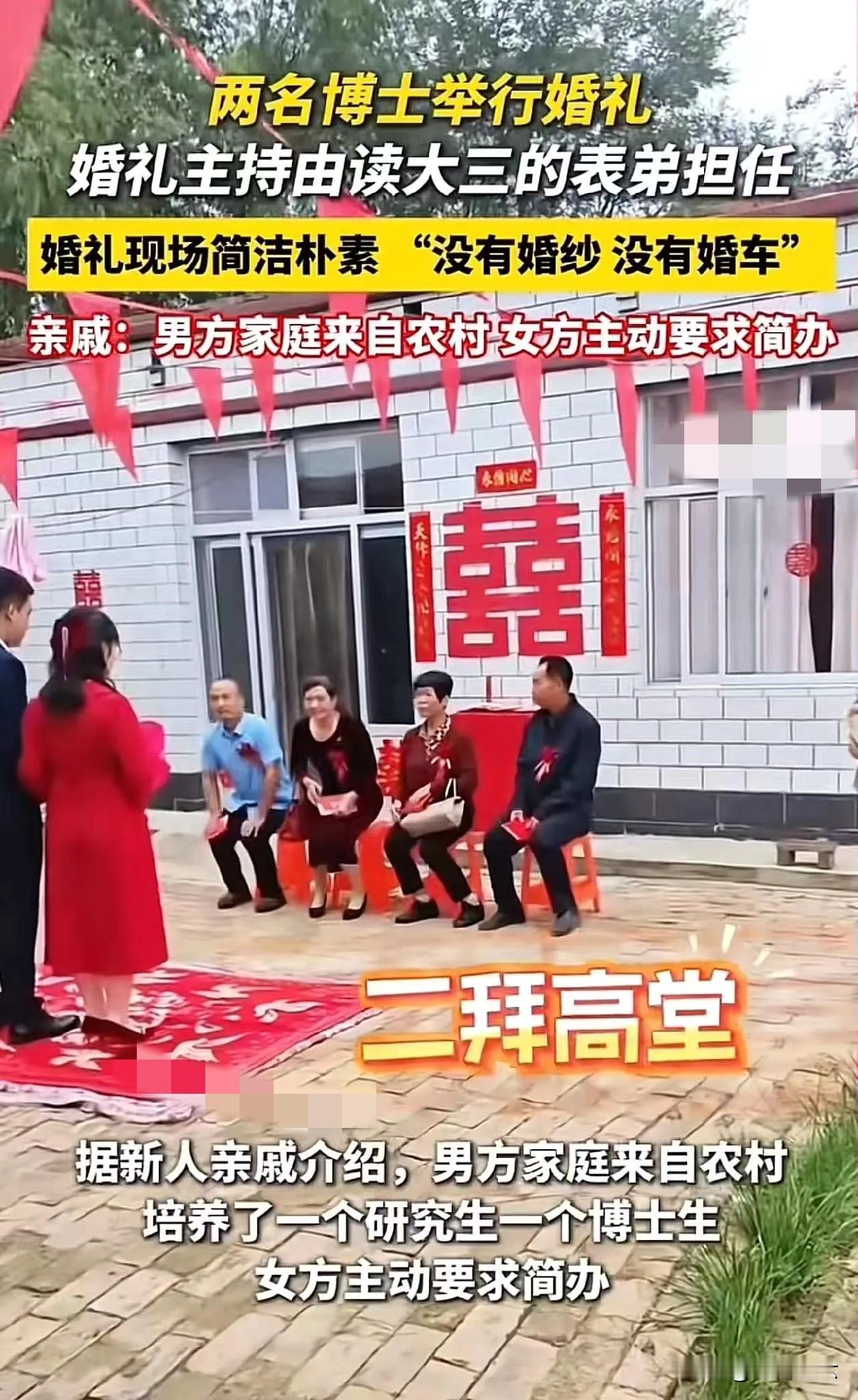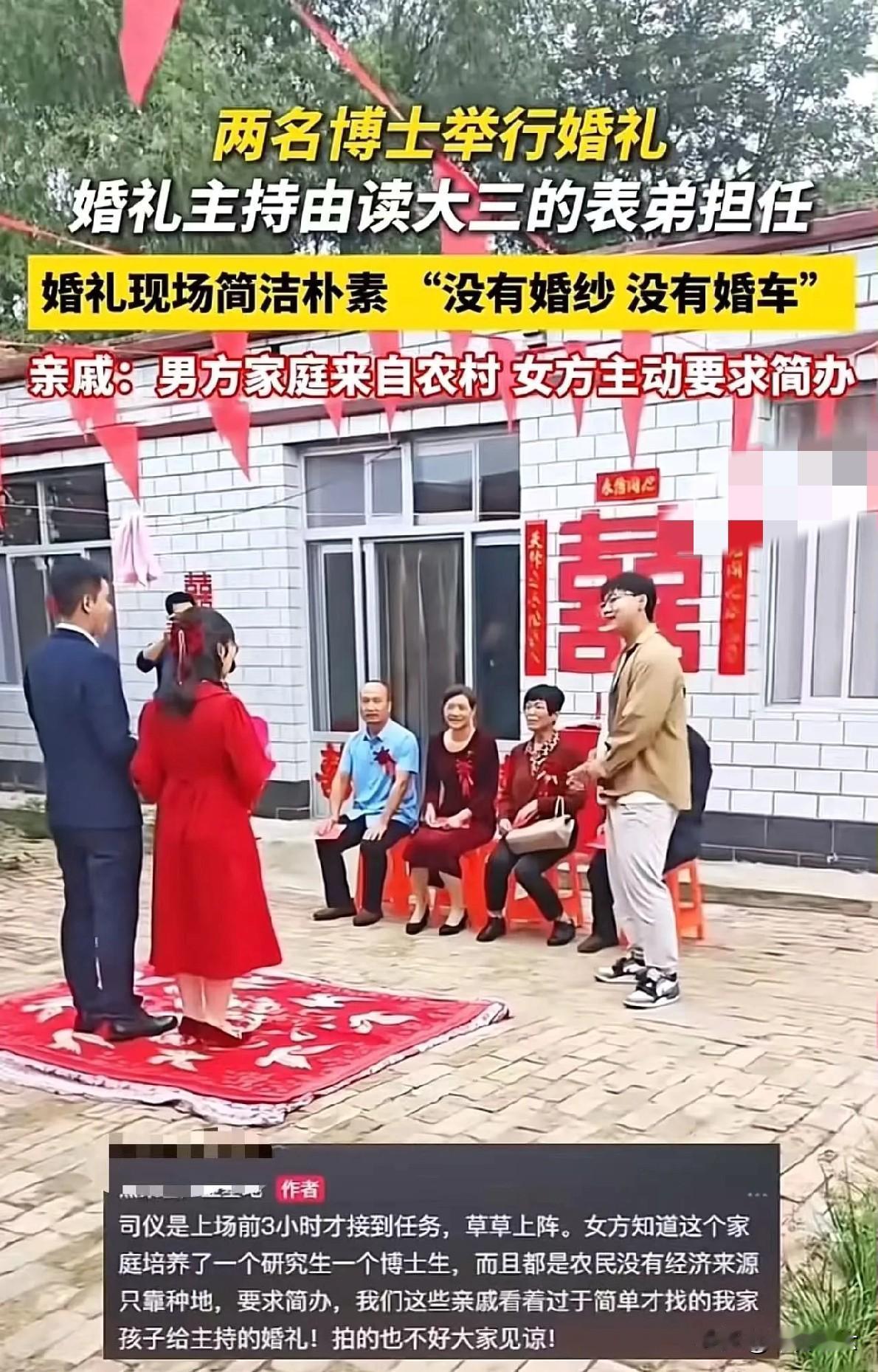 “这个新娘火了!”河北,两名博士举办的婚礼上了热搜,不是因为婚礼有多豪华,而是寒碜到不可思议,没有婚纱和婚车,甚至连司仪都没有,还是临时拉来读大三的表弟救场。而新娘的一句话让人特别暖心,她说:“这个家庭培养一个研究生不容易!” 好多人盯着“寒碜”俩字儿乐,可细想这不正是现在最缺的吗?刷短视频总刷到豪车接亲、几十桌流水席,好像婚礼没点排面就低人一等。 博士夫妇偏不凑这热闹——婚纱租了贵,不租;婚车图气派,不图;司仪要专业,自家亲戚顶上。 新娘那句话戳破多少虚头巴脑?读研读博这些年,家里砸的钱、操的心,他们比谁都清楚。 婚礼不是给外人演的戏,是俩人过日子的起点,省下的钱留着搞科研、贴补家用,不比摆阔实在? 现在年轻人被消费主义绑得太紧,好像结婚必须“达标”。这两位博士倒好,把仪式感回归到“心意”上——没有浮夸,只有清醒。 他们不是没钱办豪华婚礼,是更懂什么值得花心思。婚姻又不是KPI,用排场证明什么?日子过得踏实,比朋友圈晒九宫格有意义多了。博士生的婚礼 河北结婚 硕士婚礼 各位读者你们怎么看?欢迎在评论区讨论。