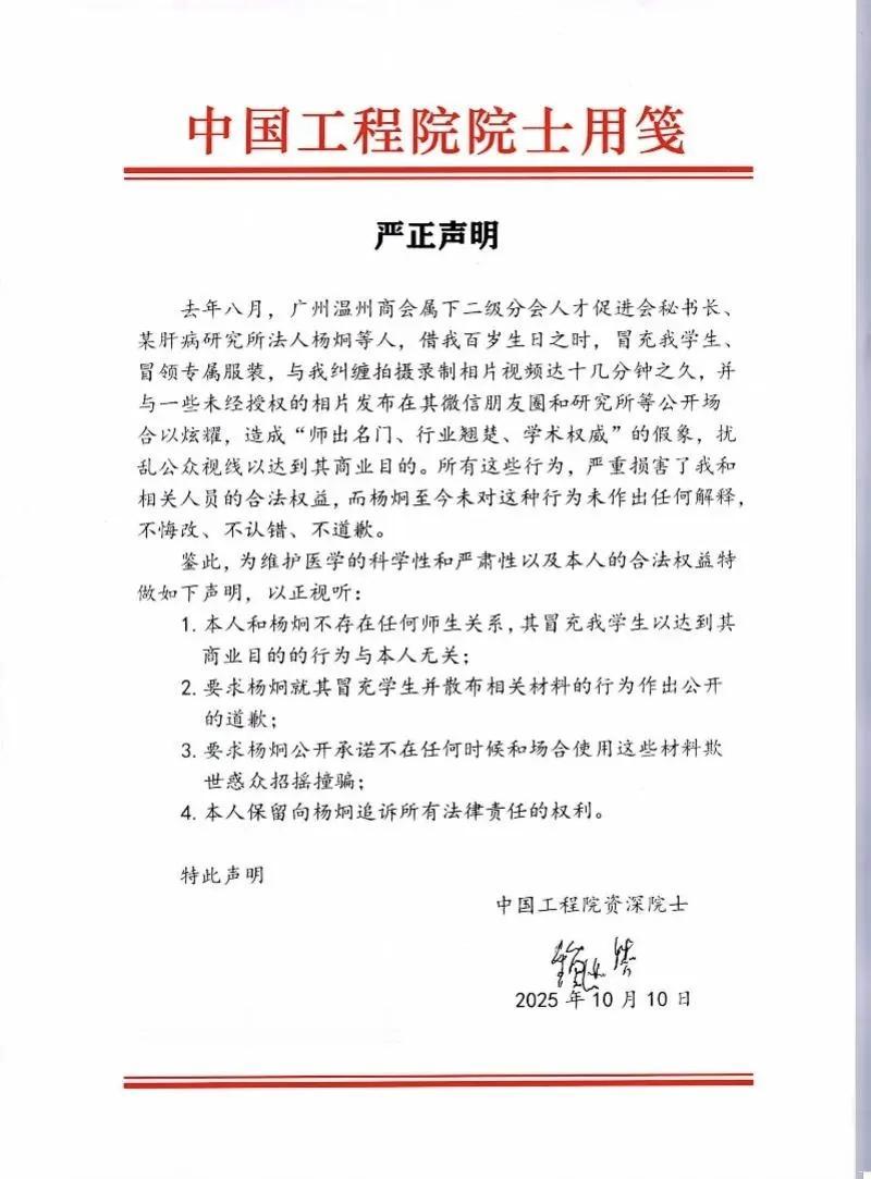 我没这个学生!10月10日,中国工程院院士、“人体解剖学泰斗”钟世镇以一封措辞严厉的声明冲上热搜。面对外界强行“攀关系”的闹剧,老人直接划清界限:“不存在任何师生关系”,字字如刀,毫不留情(详见附图)。 这个声明看起来很低调,实际上一巴掌打醒了那些热衷“蹭名人”的投机者。有人靠编造“师承关系”镀金,有人借院士名头捞资源,却没想到百岁院士根本不屑配合演出。 网友辣评:“连101岁的院士都敢碰瓷,这年头蹭流量都不要底线了?” 江湖骗子遍地走,院士亲自下场打假! 学术圈不是名利场,师徒之名更不是某些人的“社交货币”。钟老用最传统的方式,守护了最珍贵的风骨——学术尊严,从来不容消费。 活到101岁,院士眼里依旧容不下沙子。 这份“严正声明”,是给虚假人设的一记响亮耳光! 真正的学者,连“切割”都带着硬核的尊严。院士